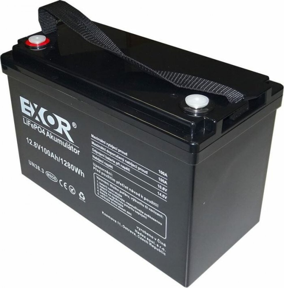 LiFePO4 baterie je určena primárně do UPS, karavanů a solárních systémů s nominálním napětím 12V jako náhrada olověné baterie. Obsahuje integrovaný bateriový management BMS pro řízení nabíjení i vybíjení a bluetooth monitoring (aplikace XiaoXiangElectric dostupná na GooglePlay a iOs). **Specifikace:**Výrobce: ExorTyp baterie: LiFePO4Jmenovité napětí: 12,8VKapacita: 100AhEnergie: 1280WhNabíjecí napětí: 14,6VOdpojení zátěže: 10,8VŠpičkový nabíjecí proud: 100AMax.vybíjecí proud: 100AMožnost vybíjení až do 0,1C (10% kapacity)Integrovaná nabíjecí automatika (BMS-baterymanagement system) – bluetooth 4.0Integrovaný výhřevteplota při nabíjení: 0° až 60°Cteplota při vybíjení: –20° až 70°Cteplota pro skladování: –5° až 35°CZávit na bateriovém kontaktu: M8Rozměry (DxŠxV): 320x158x220mmHmotnost: 9,8kg