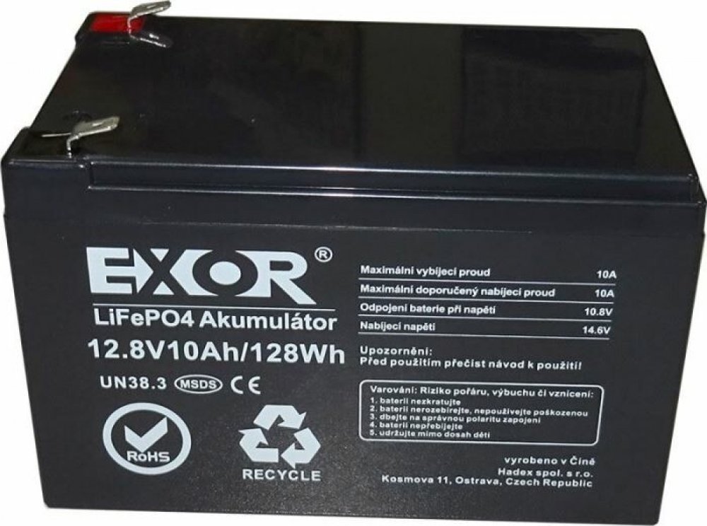 LiFePO4 baterie EXOR jsou primárně určeny do záložních zdrojů, karavanů, lodí nebo pro solární systémy s nominálním napětím 12V. Obsahují integrovaný bateriový management BMS pro ochranu a kontrolu nabíjení i vybíjení. Svým provedením a rozměry mohou být v některých případech ideální náhradou olověných baterií s násobně delší životností (až 5000cyklů.) Bez Bluetooth. **Specifikace:** - nominální napětí: 12,8V - kapacita: 10Ah- energie: 128Wh- nabíjecí napětí: 14,6V- max. trvalý nabíjecí proud: 10A (1C)- max. trvalý vybíjecí proud: 10A (1C)- max. špičkový vybíjecí proud: 14A (5sec.)- odpojení zátěže: 2000cyklů při poklesu kapacity o 0,2C (80% stav nové baterie)- BMS: integrovaný- bluetooth: NE- samovybíjení: