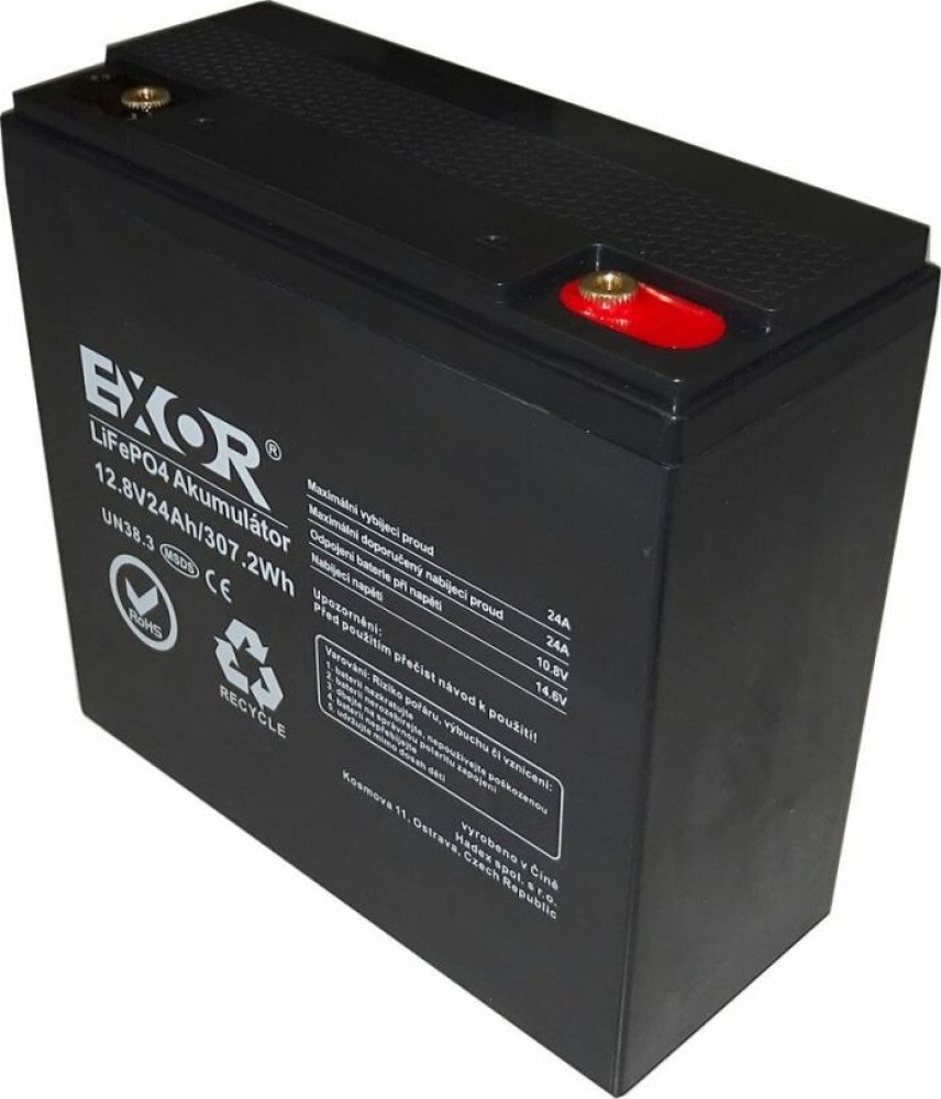 LiFePO4 baterie EXOR jsou primárně určeny do záložních zdrojů, karavanů, lodí nebo pro solární systémy s nominálním napětím 12V. Obsahují integrovaný bateriový management BMS pro ochranu a kontrolu nabíjení i vybíjení. Svým provedením a rozměry mohou být v některých případech ideální náhradou olověných baterií s násobně delší životností (až 5000cyklů.) Bez Bluetooth. **Specifikace:** - nominální napětí: 12,8V - kapacita: 24Ah- energie: 307,2Wh- nabíjecí napětí: 14,6V- max. trvalý nabíjecí proud: 24A (1C)- max. trvalý vybíjecí proud: 24A (1C)- max. špičkový vybíjecí proud: 30A(5sec.)- odpojení zátěže: 2000cyklů při poklesu kapacity o 0,2C (80% stav nové baterie)- BMS:integrovaný- bluetooth: NE- samovybíjení: