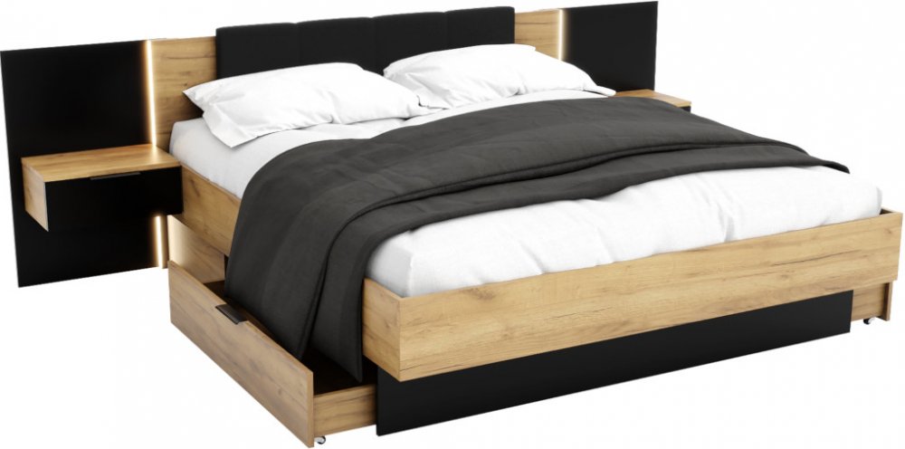 Manželská postel DOTA vám bude dovezena s roštem a zabudouvanou deskou s nočními stolky. Vyrobena je z kvalitního materiálu a vršek desky zdobí záhlavník. Máte-li zájem o celý set, navolte si v konfiguraci matraci podle vlastního uvážení. Velkou výhodou jsou dva vysouvací úložné prostory. Možnost výběru z více dekorů. Shrnutí:manželská postelroštnoční stolkyúložný prostormožnost matracevýběr z více dekorů materiály:LTD, Parametry:ABS/PVC hrana : ANOBarva 1 : hnědáBarva 2 : černáImitace : dub kraft zlatý/černáLED osvětlení : ANOMateriál 1 : LTDRošt : ANOŠířka : 274 (cm)Spací plocha : 160x200 (cm)Tloušťka materiálu : 1,8 (cm)Typ matrace : bez matraceTyp roštu : lamelovýÚložný prostor : ANOVnější délka postele : 209,2 (cm)Vnější šířka postele : 164 (cm)Výška čela u hlavy : 90 (cm)Materiál 2 :Výška roštu od země : 36,5 (cm)Výška boků : 46,4 (cm)Styl : moderníUrčení : pro dva
