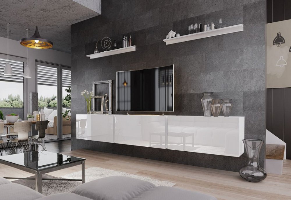 Obývací stěna ELPASO 6. Zaujme Vás jednoduchými liniemi moderní obývací sestavy. Na výrobu byl kvalitní materiál, opatřen ABS hranami, které chrání stěnu před poškozením. Dvířka jsou bez úchytu a otevírají se pomocí systému PUSH TO OPEN. Tato stěna obsahuje dvě police a tři závěsné skříňky.Shrnutí:obývací stěnahrana ABSsystém PUSH TO OPEN2 police3 závěsné skříňkynosnost závěsných dílů 5 a 15 kg dle velikost materiály:LTD, PVC Parametry:ABS/PVC hrana : ANOBarva 1 : bíláImitace : bílá/bílá leskMateriál 1 : LTDRozměry police (VxŠxH) : 7x100x10 (cm)Rozměry závěsné skříňky (VxŠxH) : 40x86x38 (cm)Úchyty : NEStyl : moderníUrčení : pro rodinu