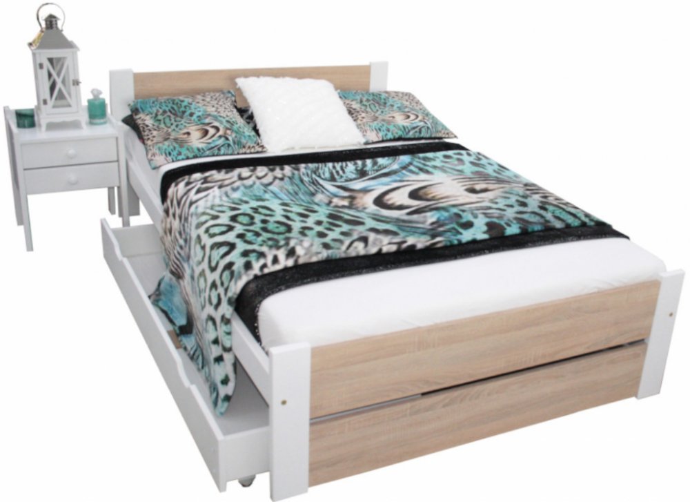 Postel HERMA. Nabízí jednoduchý design v moderním stylu, který zapadne do každého interiéru. Vyrobena je z kvalitních materiálů. Proti machanickému poškození byl použítý nezávadný lak, který postel chrání a prodlužuje životnost. Postel je dodávána s laťkovým roštěm a pěnovou matrací. Na výběr máte z více rozměrů spací plochy aImitaceu. Shrnutí: postel nezávadný lak laťkový rošt pěnová matrace výběr rozměru spací plochy výběrImitaceu materiály: masiv, MDF, PUR pěna Parametry: Barva 1 : hnědá Barva 2 : bílá Dekor : sonoma/bílá Materiál 1 : masiv Matrace : ANO Rošt : ANO Spací plocha : 180x200 (cm) Tloušťka materiálu : 2,6 (cm) Tvrdost matrace 1 : H3 - středně tvrdá Typ matrace : DE LUX - 14 cm Úložný prostor : NE Vnější délka postele : 209 (cm) Vnější šířka postele : 188 (cm) Výška čela u hlavy : 65 (cm) Výška čela u nohou : 43 (cm) Materiál 2 : MDF Styl : moderní Určení : pro dva Materiál 3 : PUR pěna