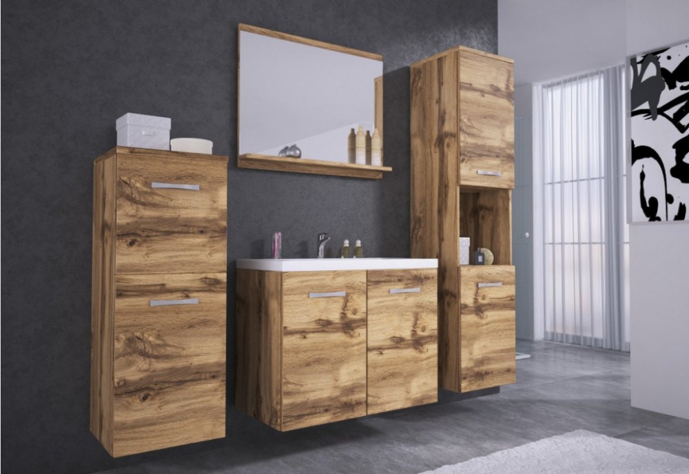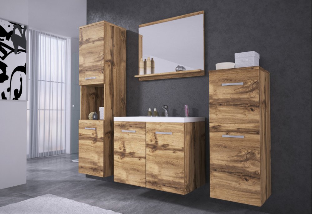 Koupelnovou sestavu ALOMA je vyrobena z kvalitního materiálu a opatřena ABS hranou. Tato kombinace chrání nábytek před poškozením. Umyvadlo dodáváme bez baterie a je vyrobeno z litého mramoru. Jedná se o směs mletého mramoru a vysoce kvalitní polyesterové pryskyřice. Celkově tento materiál vyhovuje i nejpřísnějším hygienickým normám. Sestavu tvoří závěsný regál, skříňka s umyvadlem, zrcadlo s policí a skříňka.Shrnutí:koupelnová sestavazávěsný regál, skříňka s umyvadlem, zrcadlo s policí a skříňkaúložný prostorvámi zvolenýImitace materiály:LTD, PVC, kov Parametry:ABS/PVC hrana : ANOBarva 1 : hnědáBaterie k umyvadlu : NEDekor : dub wotanMateriál 1 : LTDMateriál úchytů : kovMateriál umyvadla : litý mramorOrientace : univerzálníOrientace : univerzálníRozměry zrcadla (VxŠxH) : 50 x 60 x 10 (cm)Úchyty : ANOUmyvadlo : ANOZrcadlo : ANORozměry koupelnového regálu (VxŠxH) : 132,8 x 30,2 x 30,2 (cm)Rozměry koupelnové skříňky (VxŠxH) : 82,8 x 30,2 x 30,2 (cm)Rozměry koupelnové skříňky pod umyvadlo (VxŠxH) : 47 x 59,9 x 34,5 (cm)Rozměry umyvadla (VxŠxH) : 5 x 59,9 x 34,5 (cm)Styl : moderníUrčení : pro rodinuHmotnost : 59 kg