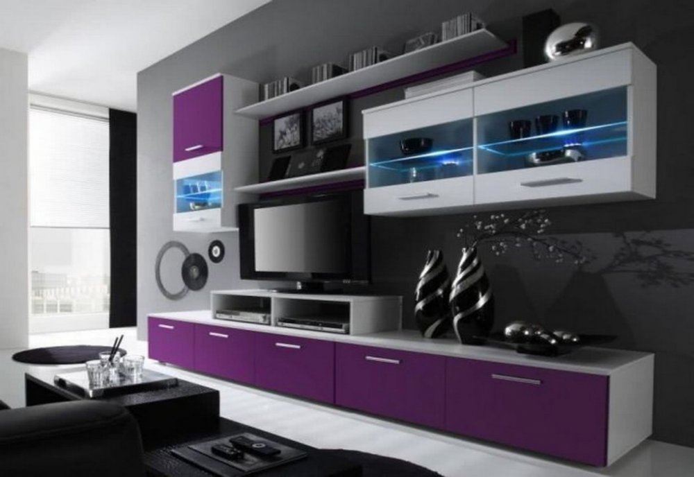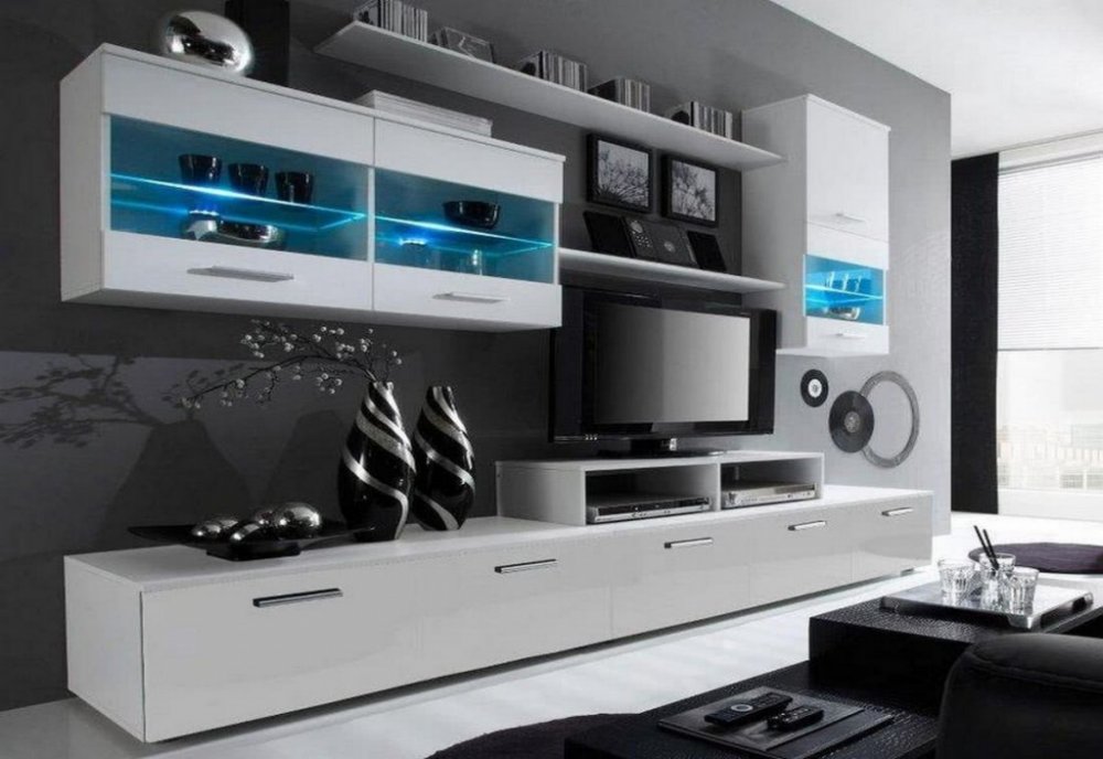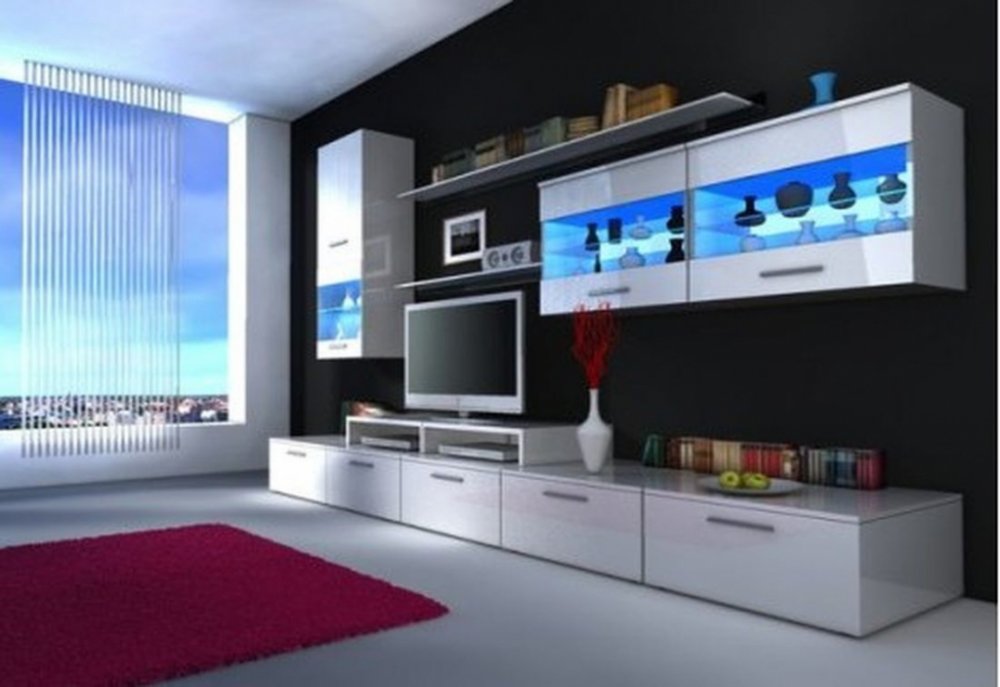 Obývací stěna RUFUS I. Je vyrobena z lamina o síle 16 mm. Korpus sestavy je vždy v bílém matu, zatímco přední části v barevném lesku. Stěna se skládá ze dvou závěsných vitrín, jedné velké a jedné malé závěsné police, velkého TV stolku s policovým nástavcem a malého samostatného TV stolku. Vitríny disponují LED osvětlením. Shrtnutí: obývací stěna lamino silné 16 mm matný korpus lesklá dvířka či zás...
