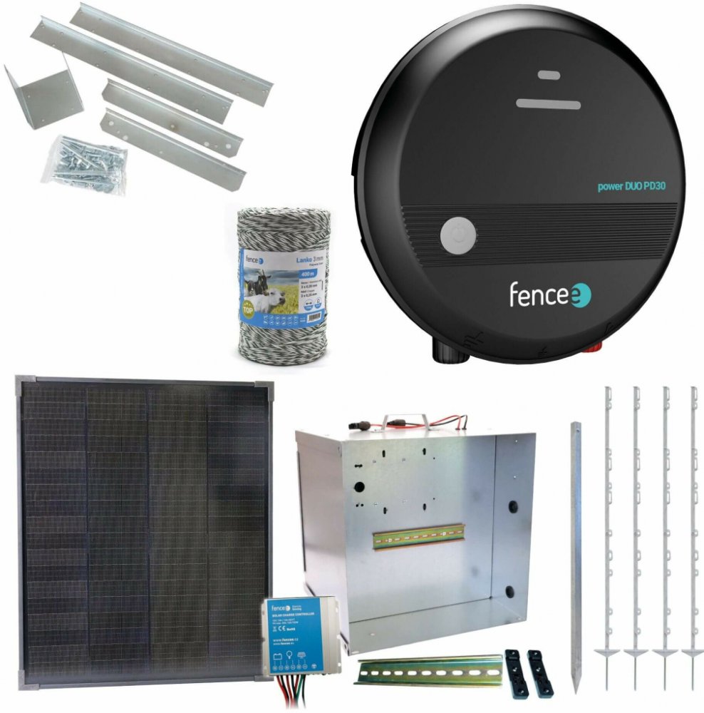 Sada solárně napájeného ohradníku s kombinovaným zdrojem 230/12 V o výkonu 3 J. Obsahuje kompletní přenosnou schránku na zdroj ohrady a baterii s regulátorem 10 A pro solární panel 40 W. Montážní konzole pro instalaci panelu na schránku. Zemnící tyč, ohradníkové kvalitní lanko 400 m a mobilní plastové sloupky 20 ks s délkou 156 cm.