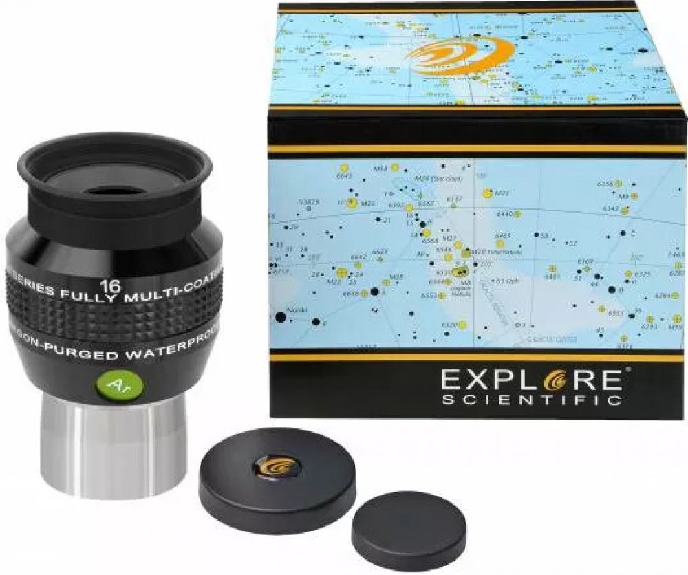 Okulár Explore Scientific AR 16mm 68° 1,25″ s vícevrstvými EMD povlaky a argonovým plněním zajišťuje vynikající kontrast, rovné zorné pole a spolehlivou vodotěsnost. Konstrukce SWA se 6 čočkami ve 4 skupinách, sklopný očnicový nástavec, závit pro filtry a homofokální vlastnost v rámci celé řady 68° Series. Skvělá volba pro vizuální astronomii i pro pozorovatele v brýlích.
