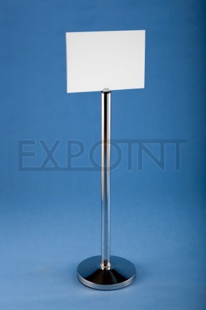 Stojan se skládá z a trubice o průměru 50 cm v provedení dekorační chrom s kulatou základnou o průměru 320 mm, vyplněnou závažím.Je vybaven bílou PVC tabulkou ze spěněného PVC tloušťky 5-6 mm.Výška stojanu bez tabulky:1050 mm. Formát tabulky A3 420 x 297 mm nebo A4 297 x 210 mm. Tabulku je možné polepit logem nebo reklamním sdělením. Stojan váží cca 8 kg...