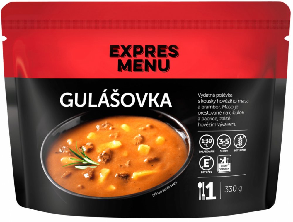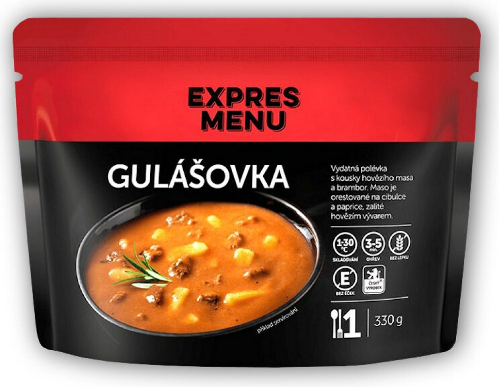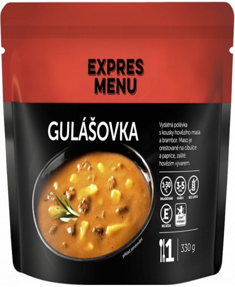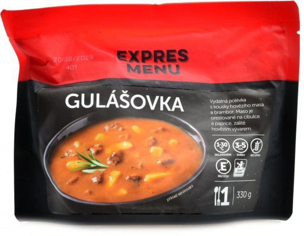 Vydatná svačinová polévka s kousky hovězího masa a brambor. Maso je orestované na cibulce a paprice, zalité hovězím vývarem. Polévka je dochucená majoránkou a česnekem. Z jednoho balení připravíte 1 porci. Trvanlivost až 10 let.