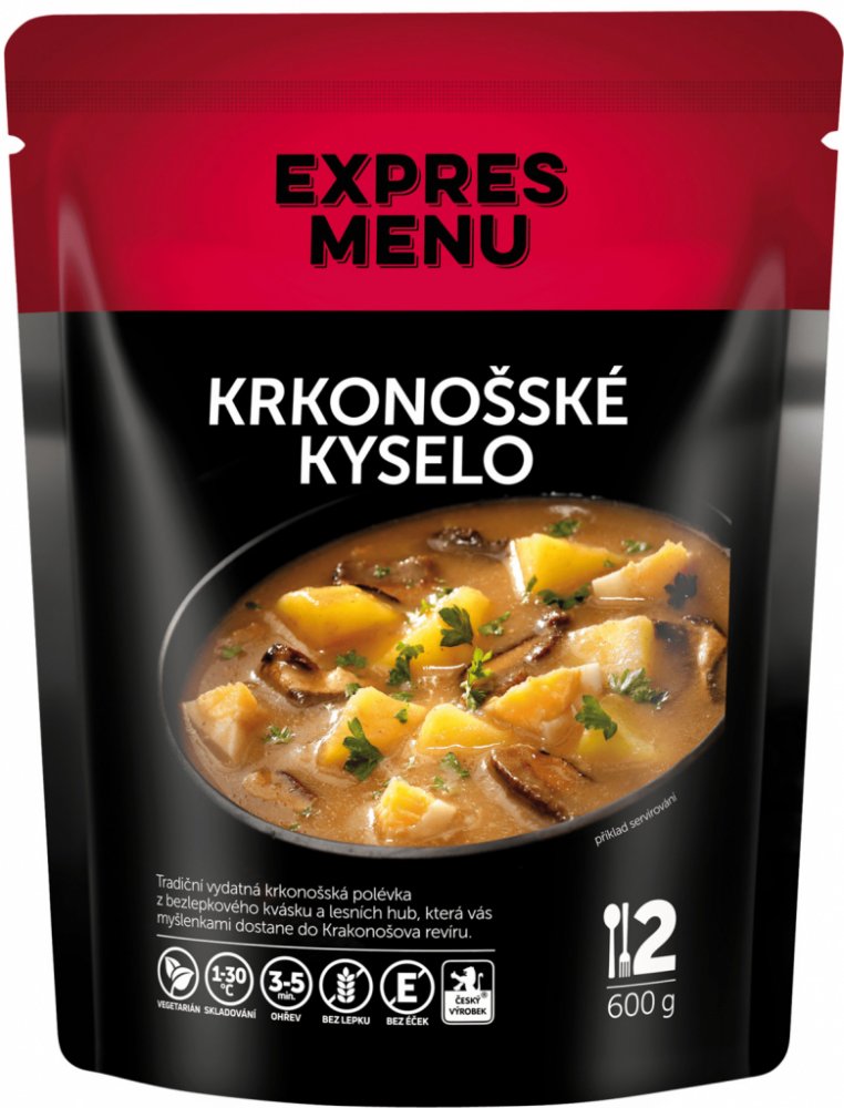 Tradiční vydatná krkonošská polévka z bezlepkového kvásku a lesních hub, která vás myšlenkami dostane do Krakonošova revíru. Tradiční vydatná krkonošská polévka Krkonošské kyselo 600 g od firmy Express Menu z bezlepkového kvásku a lesních hub, která vás myšlenkami dostane do Krakonošova revíru.
