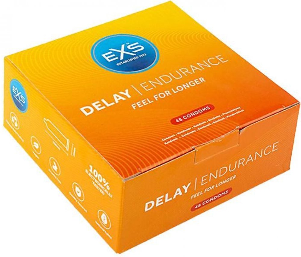 Kondomy EXS Delay Endurance jsou jedním z nejbezpečnějších a nejúčinnějších řešení pro oddálení ejakulace. Jednoduše vmasírujte znecitlivující prostředek do hlavy vašeho penisu poté, co jste nasadili kondom.