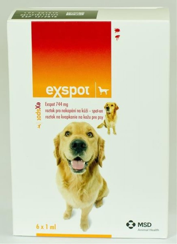 Spot-on pro psy od 2 týdnů věku proti blechám, klíšťatům a pakomárůmÚčinkuje po dobu až 4 týdnů1 tuba pro psy do 15 kg, 2 tuby pro psy nad 15 kgNepoužívat u gravidních a kojících fenNepoužívat u koček!Vyhrazený veterinární léčivý přípravek. Roztok pro nakapání na kůži - spot-on pro psySložení:Permethrinum 40:60 (cis : trans) 715 mg Methoxypropanol q.s. 1 mlCharakteristika:Roztok pro nakapání na kůži – spot-on. Čirý, jantarový roztok.Použití:Léčba a prevence ektoparazitóz vyvolaných blechami, klíšťaty a pakomáry (Phlebotomus perniciosus). Exspot zabíjí blechy a klíšťata a zajišťuje ochranu vůči reinfestaci asi po dobu 4 týdnů po aplikaci. Proti pakomárům (Phlebotomus perniciosus) má repelentní účinek po dobu 3-4 týdnů a insekticidní účinek po dobu 2 týdnů.Kontraindikace:Nepoužívat u štěňat mladších 2 týdny. Nepoužívat u koček. Nepoužívat v případě přecitlivělosti na léčivou látku nebo na některou z pomocných látek.Zvláštní upozornění pro každý cílový druh:Může dojít k uchycení jednotlivých klíšťat. Z tohoto důvodu nelze zcela vyloučit přenos infekčních chorob klíšťaty, pokud jsou podmínky nepříznivé. Vyhněte se aplikaci na srst. Nevtírejte do kůže. Vyhněte se podání přípravku na místa s poraněnou kůži. Zamezte plavání ošetřeným psům po dobu 12 hodin po aplikaci. Přípravek nepoužívejte u koček. Přípravek je pro kočky jedovatý. Jeho podání kočkám může vést až k jejich úhynu. Je důležité zabezpečit, abychom nečesali kočky stejným kartáčem jako psy. Dále je důležité zajistit, aby kočky neolizovaly místo aplikace na ošetřených psech. Jestliže se toto přihodí, oddělte zvířata a navštivte veterinárního lékaře.Zvláštní opatření určené osobám, které podávají léčivý přípravek zvířatům:Vyhněte se přímému kontaktu s přípravkem. Vyvarujte se kontaminace kůže a očí. Omyjte si ruce po použití přípravku. Potřísněná místa ihned opláchněte dostatečným množstvím vody. Při nakládání s veterinárním léčivým přípravkem několikrát po sobě (např. v psincích) by se měly používat osobní ochranné prostředky skládající se z rukavic z neoprénu nebo nitrilu o minimální tloušťce 0,3 mm. Nedotýkejte se místa aplikace po 3-6 hodin po aplikaci. Z tohoto důvodu upřednostňujte aplikaci večer. Ošetření psi by neměli spát s lidmi, zejména dětmi. Přípravek je určen pouze pro zvířata. V případě alergické reakce vyhledejte ihned lékařskou pomoc a ukažte příbalovou informaci nebo etiketu praktickému lékaři.Nežádoucí účinky (frekvence a závažnost):Výjimečně může dojít k přechodnému podráždění v místě aplikace. Po podání přípravku byly rovněž v ojedinělých případech u psů pozorovány nervové příznaky. V těchto případech omyjte psa šamponem a vyhledejte veterinárního lékaře.Použití v průběhu březosti a laktace:Laboratorní studie u laboratorních zvířat neprokázaly teratogenní účinky a maternální toxicitu. Studie u březích a laktujících fen nebyly provedeny. Přípravek lze použít pouze po zvážení terapeutického prospěchu a rizika příslušným veterinárním lékařem.Interakce s dalšími léčivými přípravky a další formy interakce:Nepodávat současně s jiným ektoparazitikem.Podávané množství a způsob podání:Kožní podání. 1 pipeta u psů do 15 kg ž.hm. včetně. 2 pipety u psů nad 15 kg ž.hm.Rozhrňte srst na zádech psa, aby byla vidět kůže. Přiložte hrot pipety na kůži. Zmáčkněte pipetu, aplikujte zhruba polovinu obsahu směrem dolů až do poloviny krku mezi lebeční bází a lopatkami. Opakujte aplikaci na bázi krku před lopatkami do vyprázdnění pipety. Pro dosažení nejlepších výsledků se ujistěte, že byl přípravek aplikován přímo na kůži, nikoli na srst.Zvláštní opatření pro uchovávání:Uchovávejte při teplotě do 25 oC. Chraňte před mrazem. Chraňte před světlem.