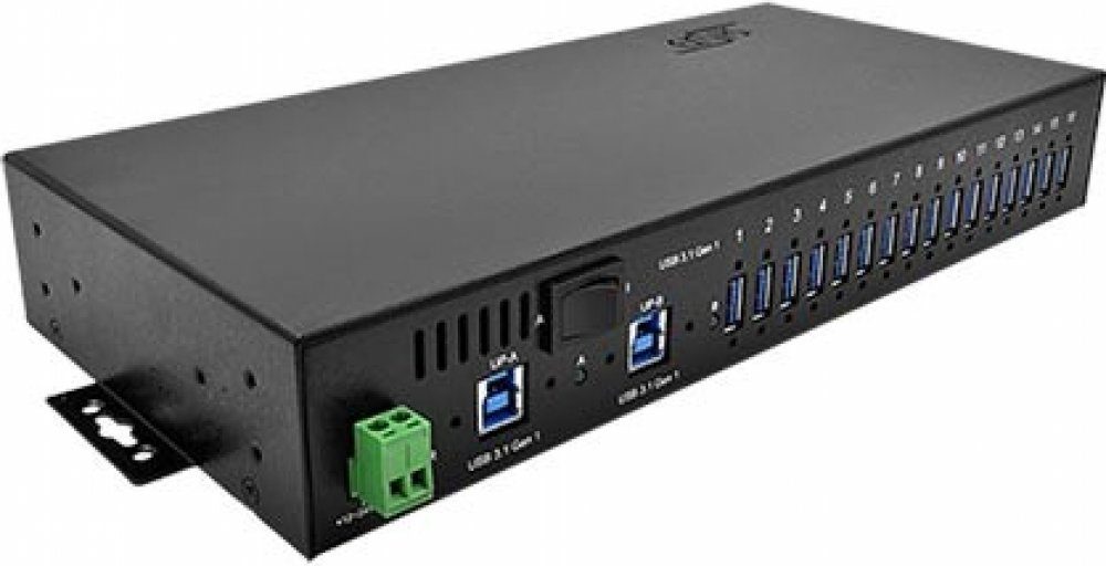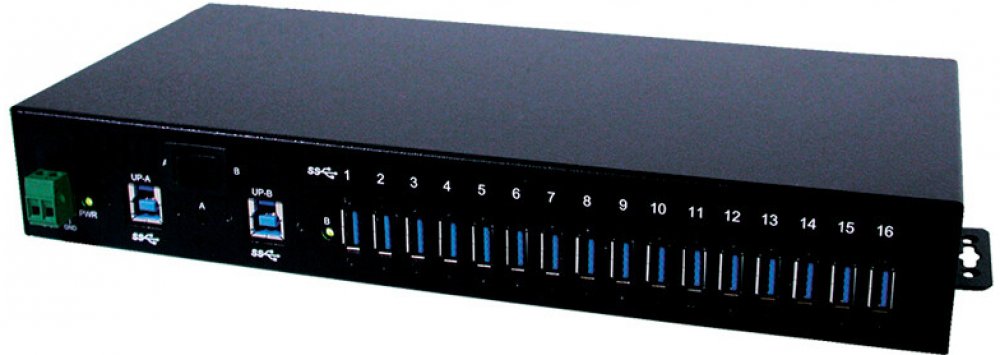 USB SuperSpeed 5Gb/s (USB 3.2 Gen.1 / USB 3.0) rozbočovač určený pro montáž na DIN lištu.; Použití: Pro připojení více USB zařízení (až 127 - je možno kaskádovat) k USB řadiči. Je možno připojit USB 3.0 (3.1 gen.1) i USB 2.0 zařízení. Hub je vybaven 2 downstream porty (pro připojení počítače) s manuálním přepínáním.; Typ: EX-1116HMVS; Čipová sada: GL3522; Konektory: vstup od počítače: 2x USB30 B(F) výstupy pro zařízení: 16x USB A(F) napájení: CPM5/2M + 2pin konektor se šroubovacími kontakty AKZ950/2F; Standardy: USB 3.0 (3.1/3.2 gen.1), USB 2.0 / 1.1 kompatibilní; Přenosová rychlost: až 5Gbps; Napájení: externí zdroj 12 - 24V ( pro přepojení na napájení po USB sběrnici je nutno přepnout jumper pod krytem hubu); Vlastnosti: - možnost instalace na DIN lištu - možnost montáže do přístrojové krabice (rozteč otvorů 293mm) - USB konektory s možností zajištění šrouby (při použití kabelů s konektory opatřenými otvory pro šrouby) - až 1,5A / port - ochrana proti elektrostatickému přepětí 15kV; Přepínání: kolébkový přepínač pro přepínání vstupů od počítače (A/B); Indikace: LED - 1x zelená (napájení), 2x zelená (port A / B); Barva: černá; Materiál: kov; Rozměry: 280 (316 včetně úchytů) x 43 x 130mm (139 včetně konektoru napájení) (šířka x výška x hloubka); Obsah balení: USB HUB, kabel USB30 A(M) - USB30 B(M) 1,8m, adaptér na DIN lištu, konzole pro montáž do 19" rozvaděče; Druh obalu: papírová krabice;USB SuperSpeed 5Gb/s (USB 3.2 Gen.1 / USB 3.0) rozbočovač určený pro montáž na DIN lištu.; Použití: Pro připojení více USB zařízení (až 127 - je možno kaskádovat) k USB řadiči. Je možno připojit USB 3.0 (3.1 gen.1) i USB 2.0 zařízení. Hub je vybaven 2 downstream porty (pro připojení počítače) s manuálním přepínáním.; Typ: EX-1116HMVS; Čipová sada: GL3522; Konektory: vstup od počítače: 2x USB30 B(F) výstupy pro zařízení: 16x USB A(F) napájení: CPM5/2M + 2pin konektor se šroubovacími kontakty AKZ950/2F; Standardy: USB 3.0 (3.1/3.2 gen.1), USB 2.0 / 1.1 kompatibilní; Přenosová rychlost: až 5Gbps; Napájení: externí zdroj 12 - 24V ( pro přepojení na napájení po USB sběrnici je nutno přepnout jumper pod krytem hubu); Vlastnosti: - možnost instalace na DIN lištu - možnost montáže do přístrojové krabice (rozteč otvorů 293mm) - USB konektory s možností zajištění šrouby (při použití kabelů s konektory opatřenými otvory pro šrouby) - až 1,5A / port - ochrana proti elektrostatickému přepětí 15kV; Přepínání: kolébkový přepínač pro přepínání vstupů od počítače (A/B); Indikace: LED - 1x zelená (napájení), 2x zelená (port A / B); Barva: černá; Materiál: kov; Rozměry: 280 (316 včetně úchytů) x 43 x 130mm (139 včetně konektoru napájení) (šířka x výška x hloubka); Obsah balení: USB HUB, kabel USB30 A(M) - USB30 B(M) 1,8m, adaptér na DIN lištu, konzole pro montáž do 19" rozvaděče; Druh obalu: papírová krabice; Ke stažení: Katalogový list