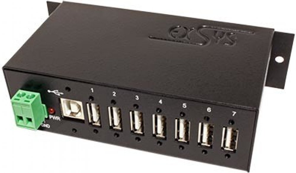 USB 2.0 rozbočovač určený pro montáž na DIN lištu.; Použití: Pro připojení více USB zařízení (až 127 - je možno kaskádovat) k USB řadiči. Je možno připojit USB 2.0 i USB 1.1 zařízení.; Typ: EX-1177HMV; Čipová sada: D720113GK; Konektory: USB B(F) / 7x USB A(F) / 2pin konektor se šroubovacími kontakty MRT8/2M ( pro napájení); Standardy: USB 2.0, USB 1.1 kompatibilní; Přenosová rychlost: 1,5 / 12 / 480 Mbps; Napájení: externí zdroj 7 - 24V ( pro přepojení na napájení po USB sběrnici je nutno přepnout jumper pod krytem hubu); Další informace: -možnost instalace na DIN lištu - možnost montáže do přístrojové krabice (rozteč otvorů 120mm); Indikace: LED - 1x červená (napájení); Barva: černá; Materiál: kov; Rozměry: 113 (133 včetně čela) x 36 x 66mm (74 včetně konektoru napájení) (šířka x výška x hloubka); Obsah balení: USB HUB,kabel USB A(M) - USB B(M) 1,8m, adaptér na DIN lištu; Druh obalu: papírová krabice; Hmotnost výrobku: 285g; Celková hmotnost (včetně obalu): 450g