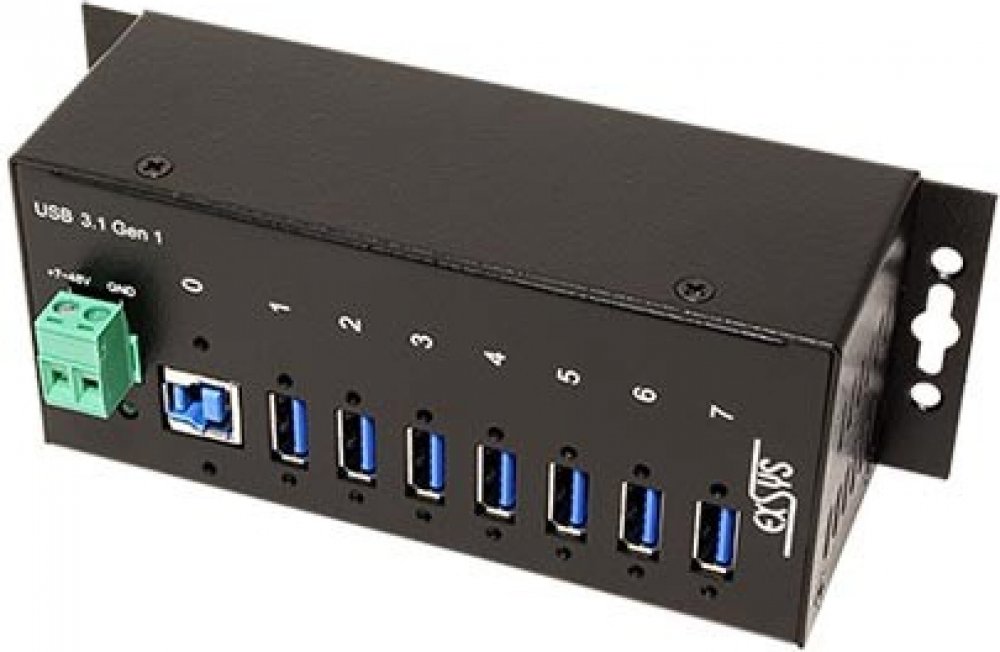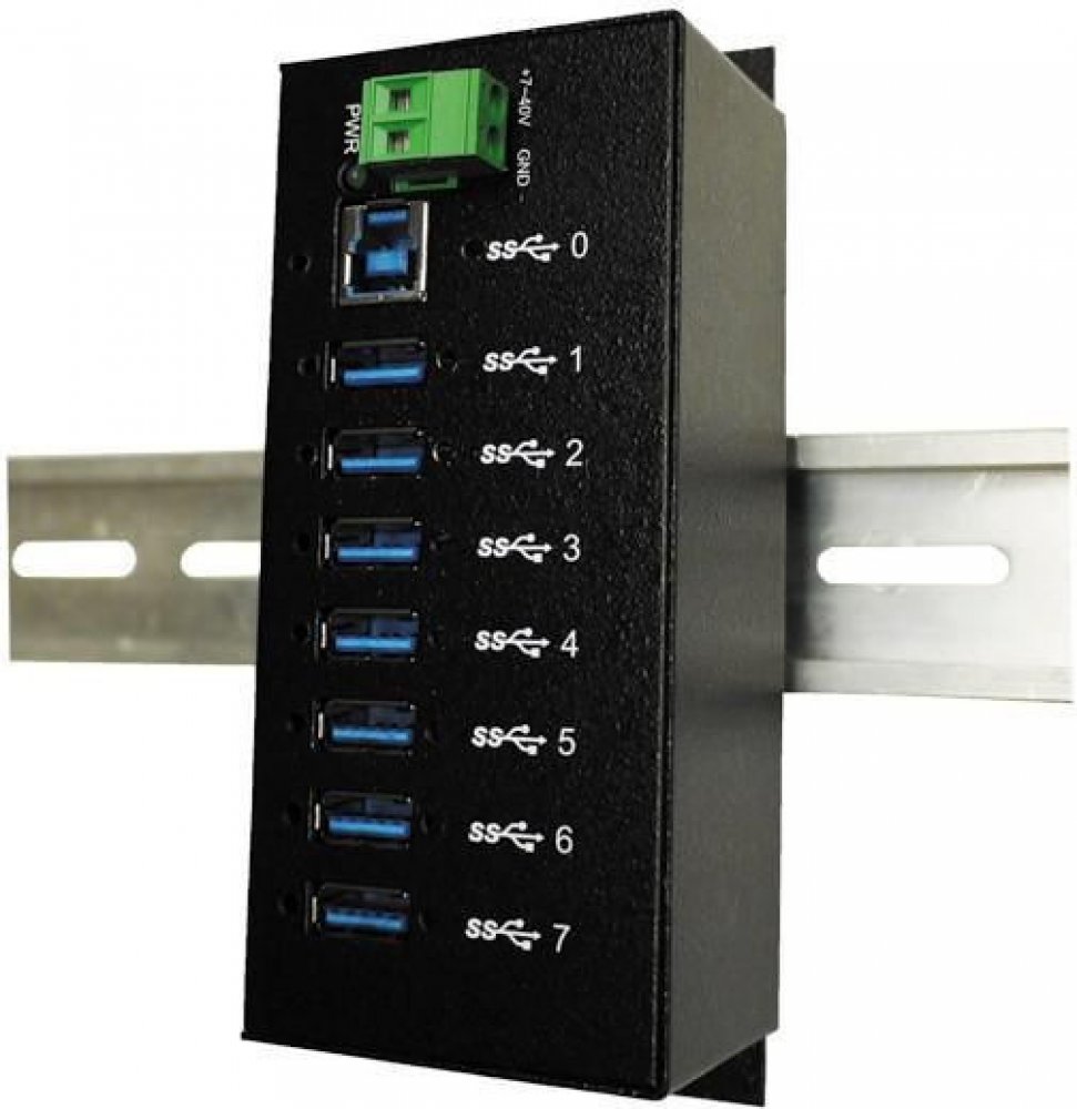 USB 3.0 rozbočovač určený pro montáž na DIN lištu.; Použití: Pro připojení více USB zařízení (až 127 - je možno kaskádovat) k USB řadiči. Je možno připojit USB 3.0 (3.1 gen.1) i USB 2.0 zařízení.; Typ: EX-1177HMVS; Čipová sada: GL3520; Konektory: USB30 B(F) / 7x USB30 A(F) / 2pin konektor se šroubovacími kontakty MRT8/2M ( pro napájení); Standardy: USB3.0, USB 2.0 / 1.1 kompatibilní; Přenosová rychlost: až 5Gbps; Napájení: externí zdroj 7 - 40V ( pro přepojení na napájení po USB sběrnici je nutno přepnout jumper pod krytem hubu); Vlastnosti: - možnost instalace na DIN lištu - možnost montáže do přístrojové krabice (rozteč otvorů 133mm) - USB konektory s s možností zajištění šrouby (při použití kabelů s konektory opatřenými otvory pro šrouby) - až 1,5A / port - ochrana proti elektrostatickému přepětí 15kV; Indikace: LED - 1x zelená (napájení); Barva: černá; Materiál: kov; Rozměry: 122,5 (144,5 včetně čela) x 55 x 45mm (54 včetně konektoru napájení) (šířka x výška x hloubka); Obsah balení: USB HUB,kabel USB30 A(M) - USB30 B(M) 1,8m, adaptér na DIN lištu; Druh obalu: papírová krabice; Hmotnost výrobku: 330g; Celková hmotnost (včetně obalu): 690g