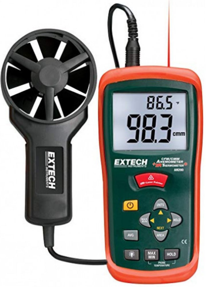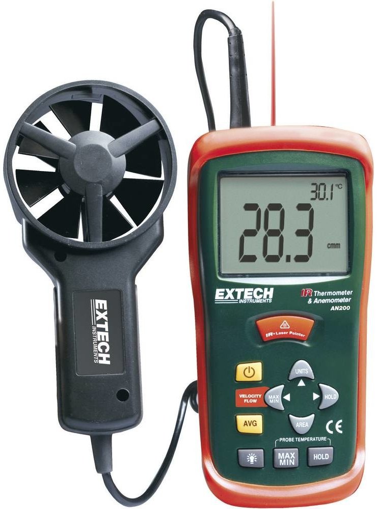 Měřící přístroj ke stanovení proudění vzduchu a rychlosti větru prostřednictvím proudového čidla s kuličkovým ložiskem. Díky vestavěné funkci pro zobrazení množství proudícího vzduchu (objemu) je tento přístroj ideální pro použití ve větrací technice apod. Doplňkově se zabudovaným infračerveným termometrem pro bezdotykové měření teploty.