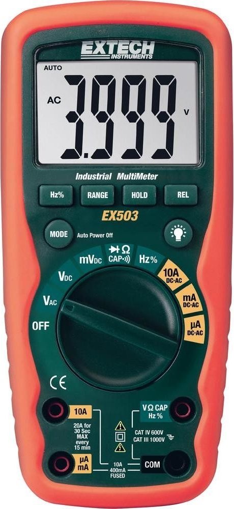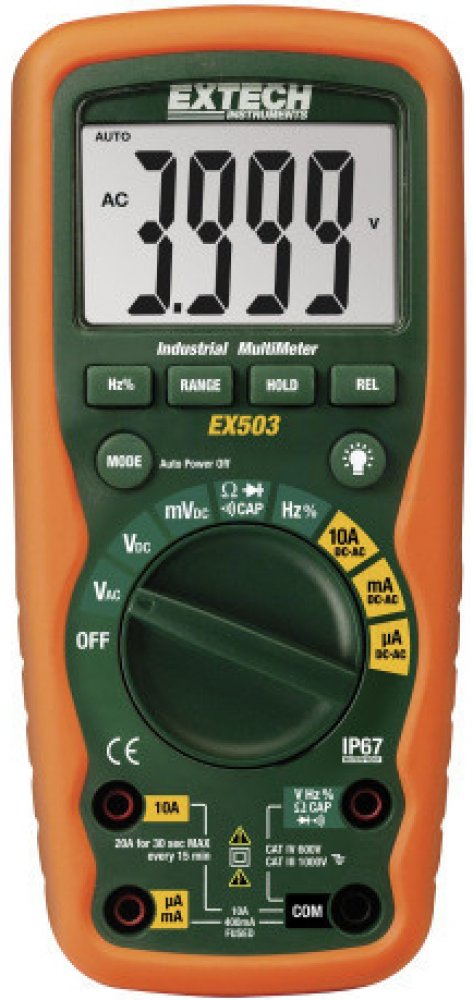 Průmyslový multimetr EX503 je vodotěsný (IP67) a díky pouzdru s nastříkanou ochranou z měkké pryže je extrémně robustní. Po pádu z výšky dvou metrů zůstává tento měřicí přístroj nedotčený. Přístroj je vhodný zejména pro použití venku a za extrémních podmínek.
