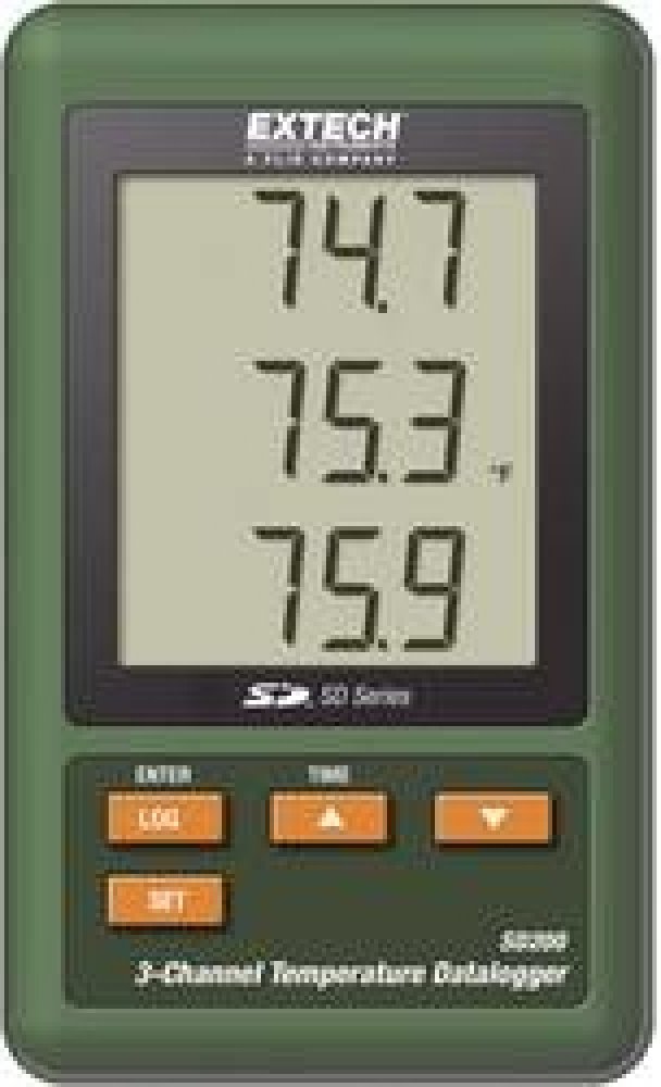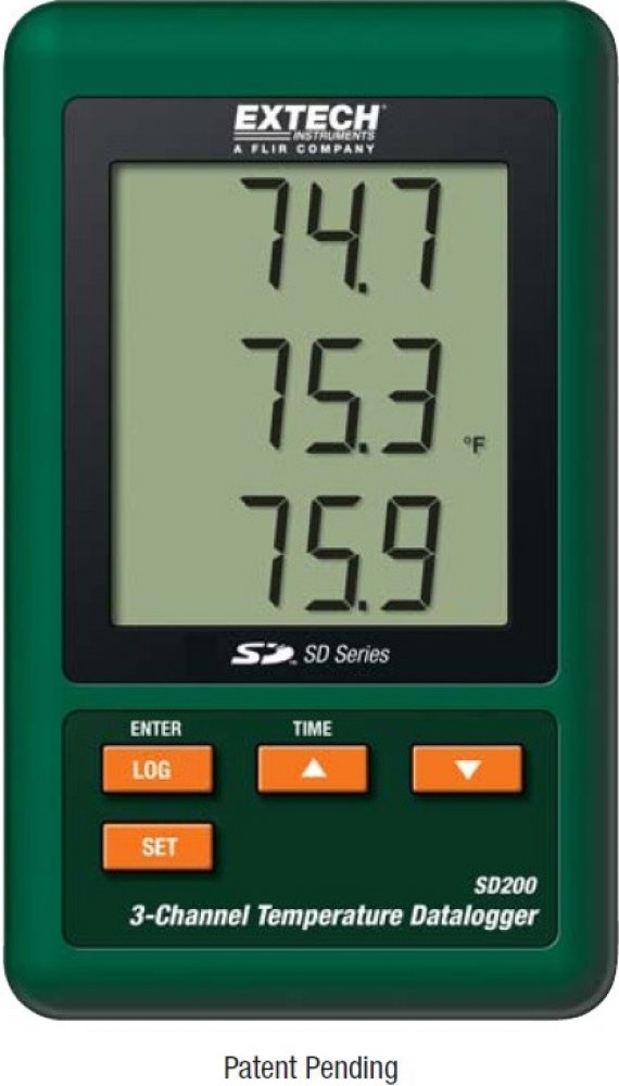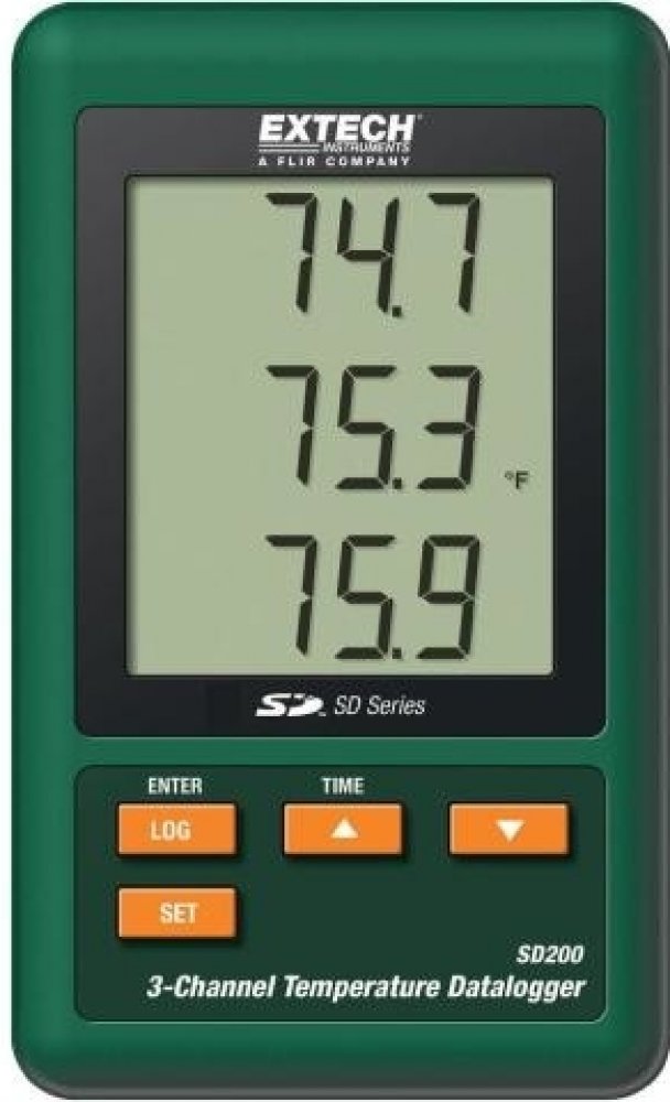 Tříkanálový záznamový teploměr Extech SD 200 zobrazuje a ukládá měření teploty z jednoho až tří teplotních kanálů typu K. Naměřené údaje se ukládají na SD kartu, záznam se zadává s datovým a časovým razítkem a data se ukládají na SD kartu ve formátu Excel® pro snadný přenos do počítače. Tříkanálový záznamový teploměr Extech SD 200 je před expedicí plně testován a kalibrován.