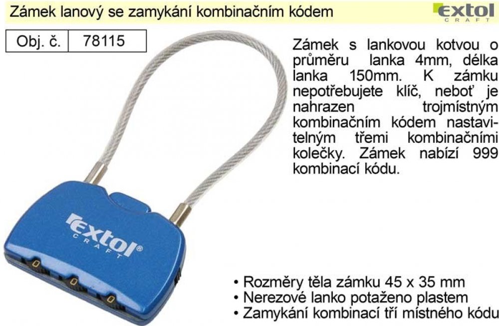 Zámek lankový s trojmístným kódem, EXTOL CRAFT