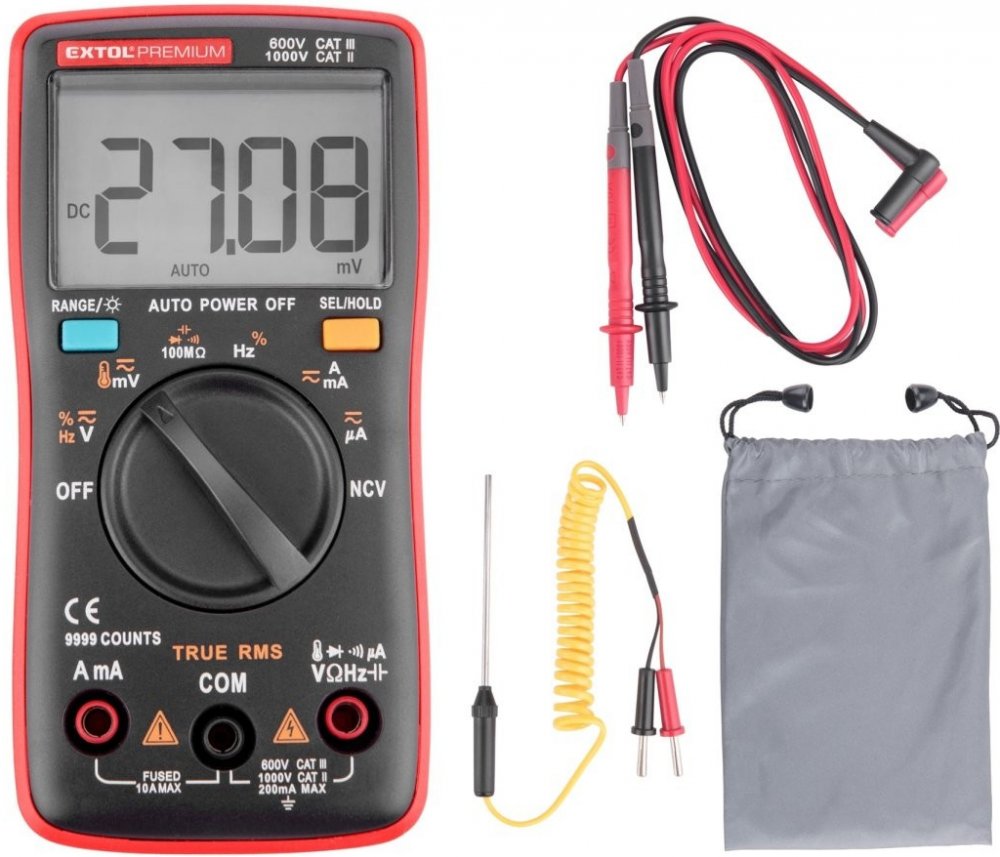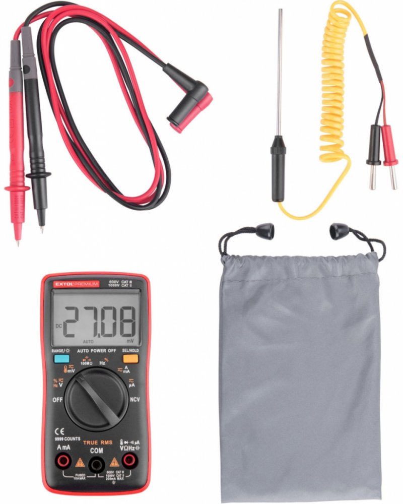 doplňující parametr: rozsahy měření: DC napětí 1mV-1000V, AC napětí 1mV-750V, DC a AC proud 10µA-10A, odpor 1Ω-100MΩ, kapacita 1nF-100mF, frekvence 10Hz-10MHz, teplota -20°C-1000°C, měření diod, spojitosti obvodů a bezkontaktní detekce napětí, záznam právě naměřené hodnoty, TrueRMS, displej 9999, baterie 2x1,5V typ AA (součást dodávky), hmotnost s bateriemi 138g