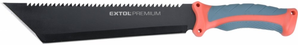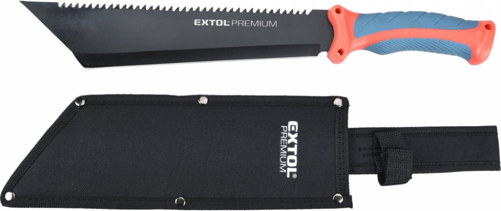 Mačeta, 395/135mm, EXTOL PREMIUM Hlavní přednosti: Čepel z nerezové oceli s elegantní černou povrchovou úpravou. Dodáváno s nylonovým pouzdrem. Rukojeť v kombinaci tvrdého polypropylenu s měkkou TPR pryží. Speciální tvar čepele do písmene ...