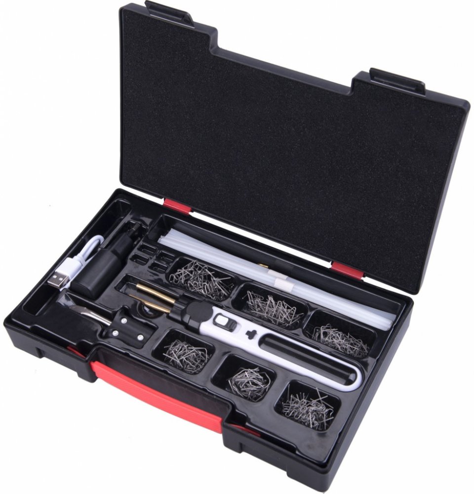 Obsah balení: nástroj, 6 balíčků spon (různé tvary), 3 balíčky plnících tyčinek (PP/PE/ABS), pájecí nástavec, USB kabel