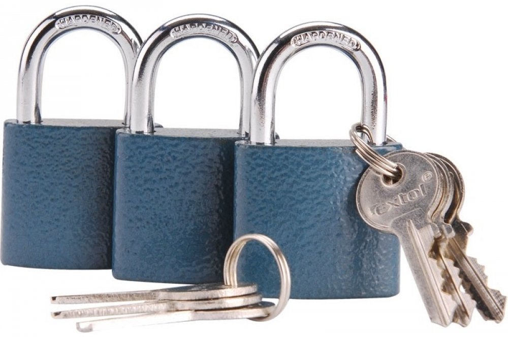 Sada visacích litinových zámků se závěsným okem z kvalitní tvrzené oceli. Tělo zámku z kvalitní litiny s vnitřní zinkovou povrchovou úpravou zvyšující odolnost proti korozi. Mosazná cylindrická vložka. Zámky jsou sjednocené a jedním klíčem lze otevřít