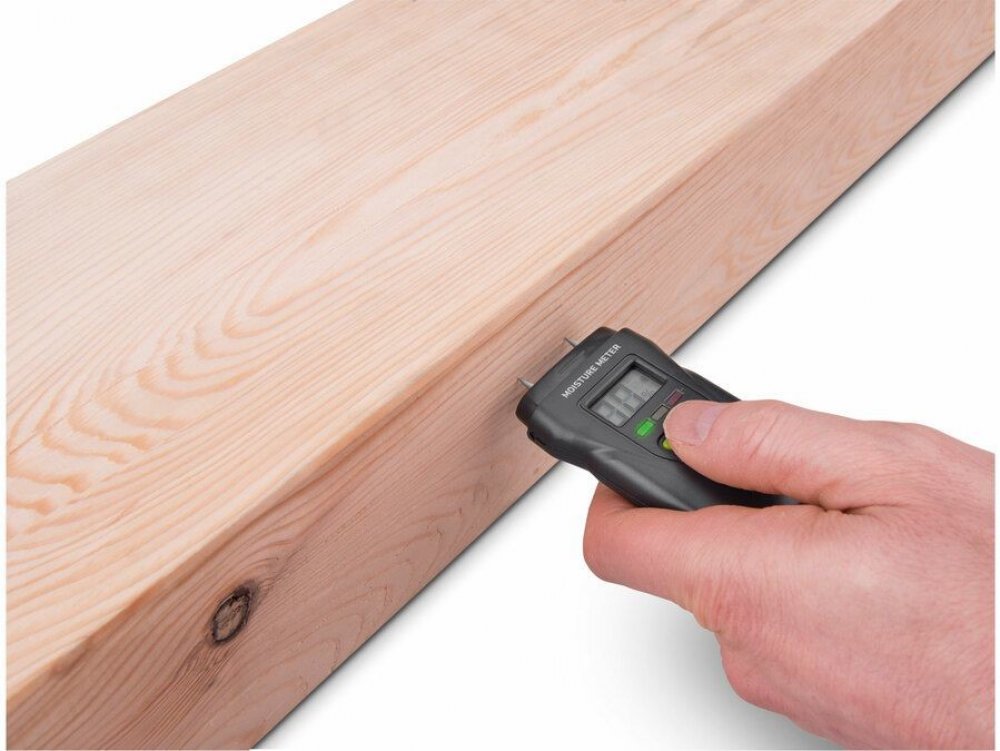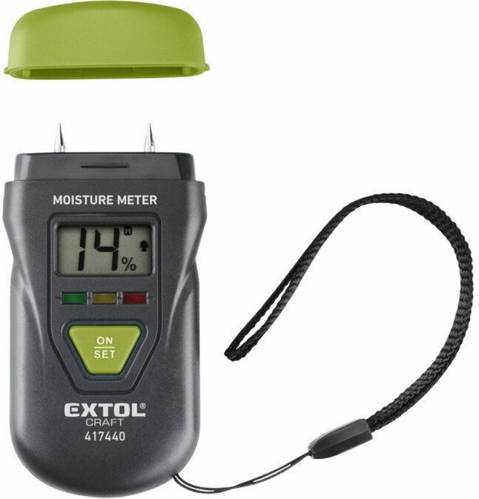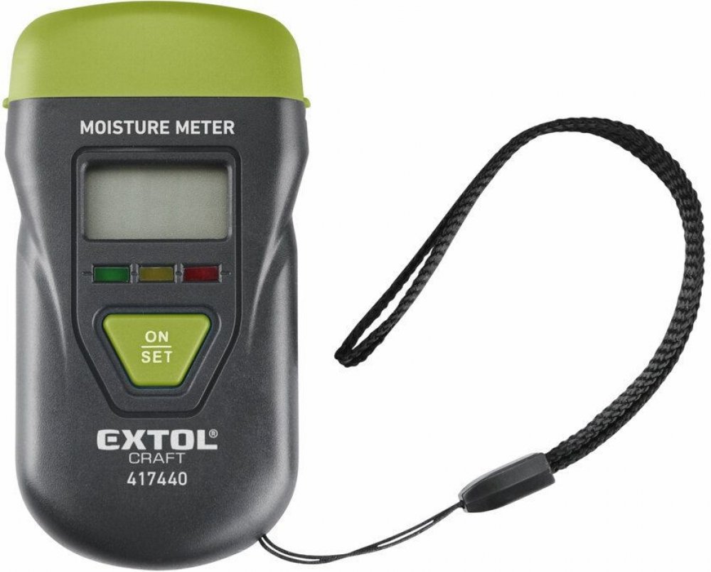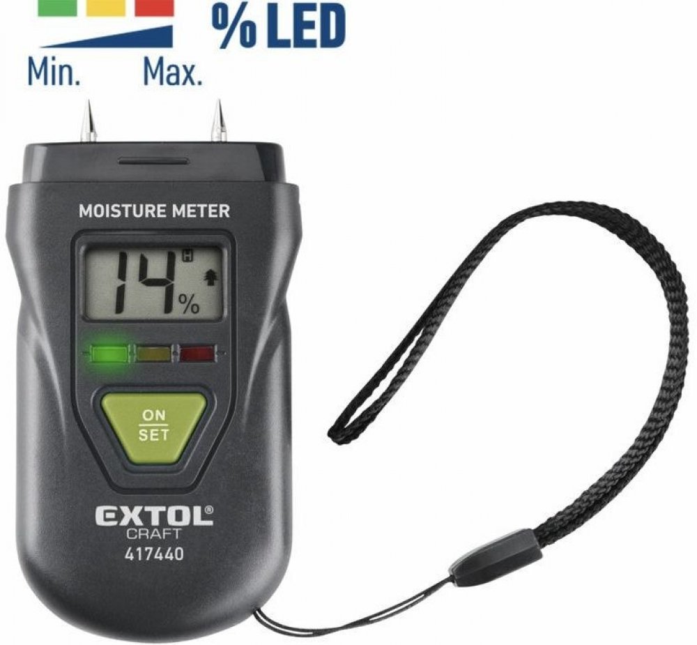 Vlhkoměr je vhodný pro měření vlhkosti v řezaném dřevě (také v papíru, kartonu) a vytvrzených materiálech (malta, beton a sádra). Zobrazuje také vlhkost nebo teplotu ovzduší. Má tři LEDky, které indikují vlhkost měřeného materiálu.