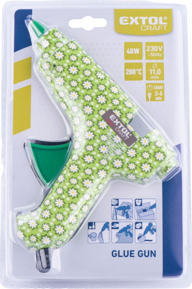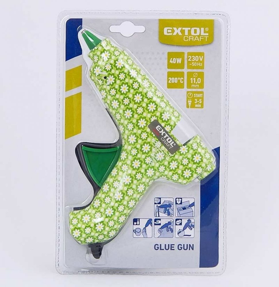 Lepící tavná pistole s příkonem 40 W vám umožní rychle přilepit papír, korek, dřevo, kůži, textilie, umělé hmoty či keramiku. Určena pro tavné tyčinky o průměru 11 mm.