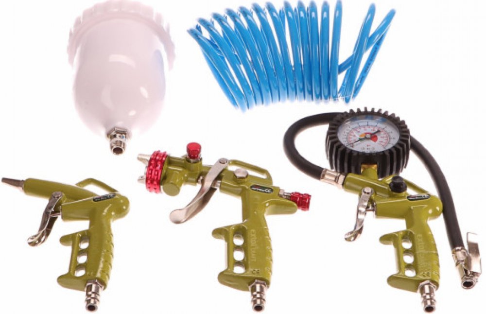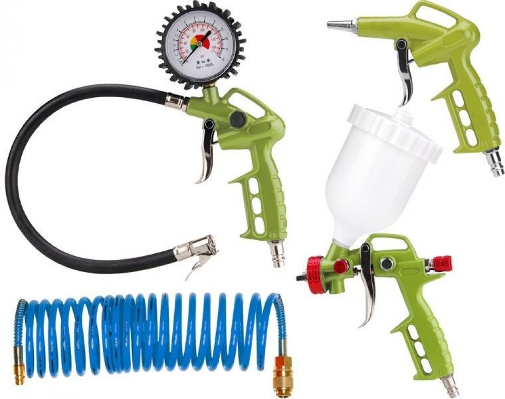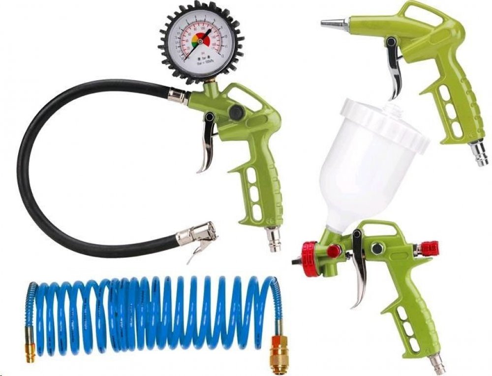 Obsahuje: stříkací a ofukovací pistoli, plnič pneumatik, spirálovou vzduchovou hadici 4 m