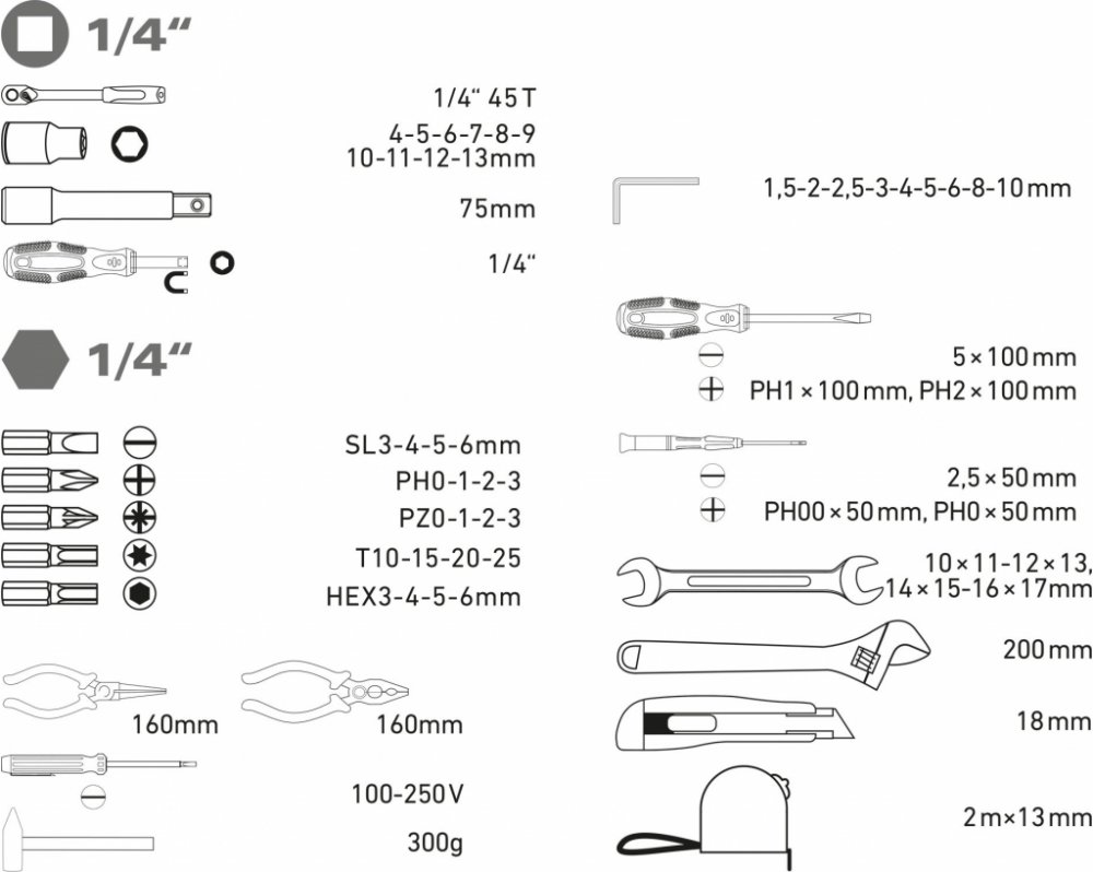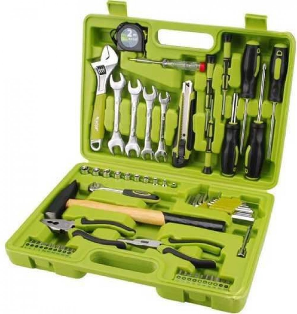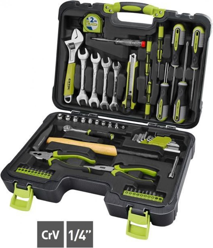 Sada nářadí se širokým spektrem použití. Bohatá kombinace nejpoužívanějších kleští, šroubováků, klíčů doplněná o zámečnické kladivo a zkoušečku napětí. Díky svému složení je sada vhodná zejména na domácí použití. Výborně se hodí i jako záložní sada do auta. Sada je v plastovém kufru pro snadné skladování a přenášení.