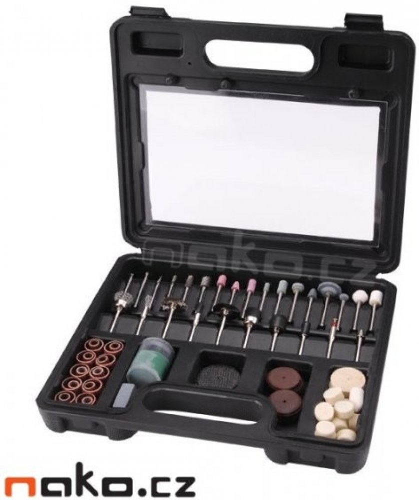 Sada nástavců na přímou brusku na řezání, broušení, hlazení i hrubé opracování dřeva, skelného laminátu, plastů, kovů a barevných kovů. Sada obsahuje 100 ks nástavců. Široká škála druhů nástavců umožňuje jejich různorodé použití. Dodáváno přehledně uložené v kufříku.