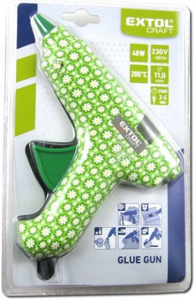 Pistole tavná lepící, květinová, 40W, 11mm, EXTOL CRAFTLepící tavná pistole je určena k rychlému slepení papíru, korku, dřeva, kůže, textilie, umělé hmoty, keramiky atd. Páčka mechanického posuvu umožňuje citlivé, plynulé a přesné dávkování roztaveného lepidla na požadované místo. Hlavní technické parametry: napětí/frekvence: 230V/50Hzpříkon: 40Wprůměr tavné tyčinky: 11mmdoba aktivace: 3-5minteplota lepeni: 200°Clepené materiály: papír, korek, dřevo, kůže, textil, umělá hmota, karamika apod.