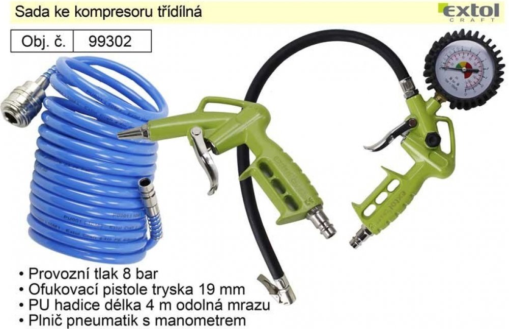 Kompresorová sada Extol Craft (99302) kompresorová sada 3ks, max. 8bar (0,8MPa), pistole ofukovací, pistole foukací s manometrem, spirálová hadice 4m s rychlospojkami