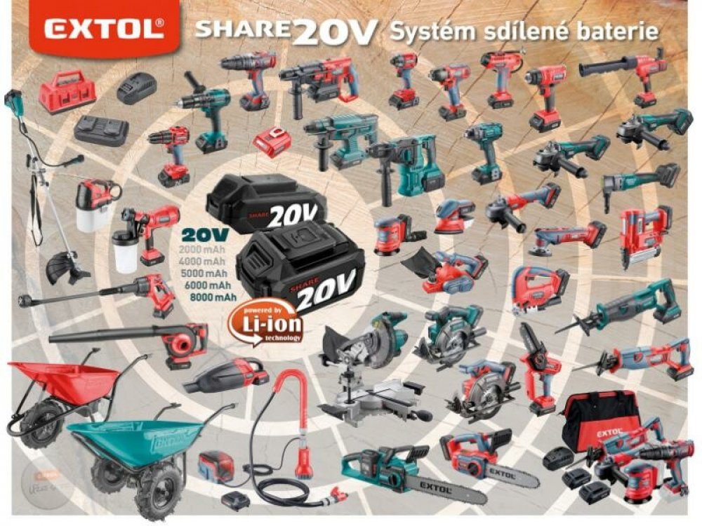 Akumulátor je kompatibilní se všemi typy nářadí řady Extol SHARE20V. Díky technologii Li-Ion je možné akumulátory kdykoliv dobíjet, aniž by se snižovala jejich kapacita. Li-Ion akumulátor ztrácí energii vlivem samovybíjení velmi pomalu a vydrží dlouho nabitý.
