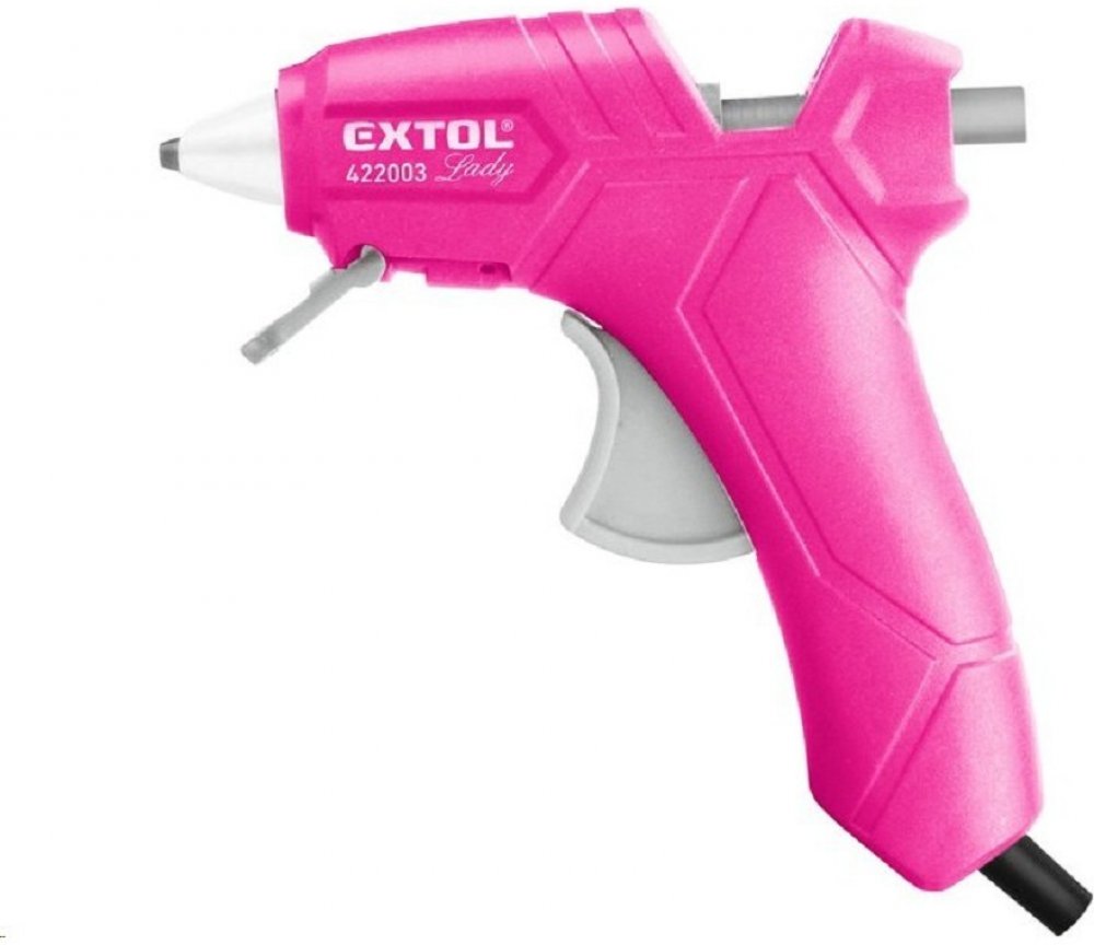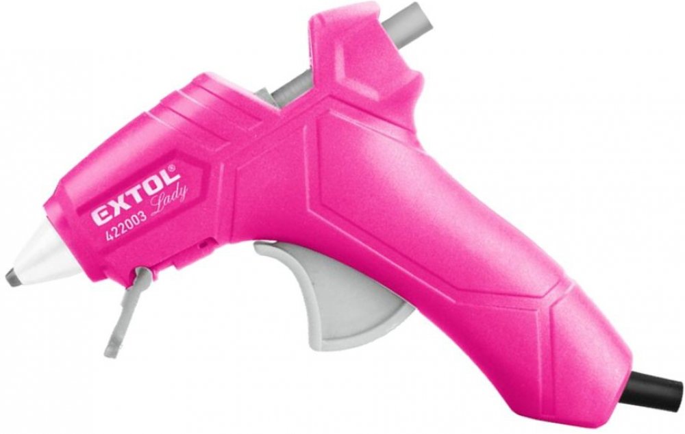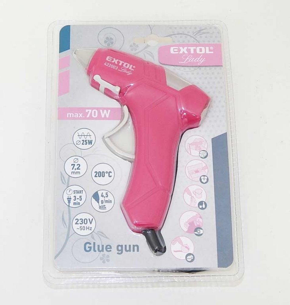 Lepící tavná pistole s příkonem 25 W je určena pro tavné tyčinky o průměru 7,2 mm. Lze použít ke slepení papíru, korku, dřeva, kůže, textilie, umělé hmoty, keramiky atd.