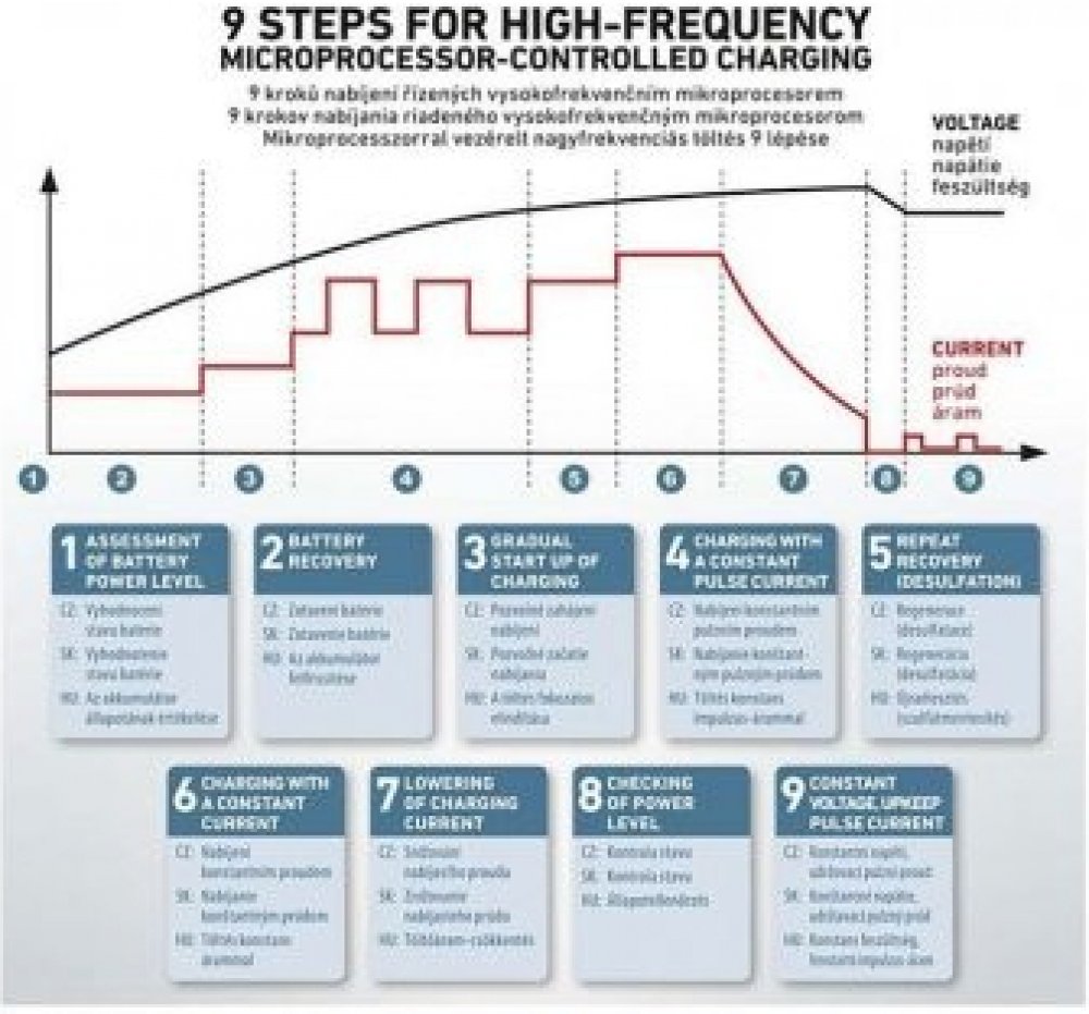- regeneruje a nabíjí hluboce vybité baterie (desulface) a umožuje nabíjet baterie i při nízkých teplotách