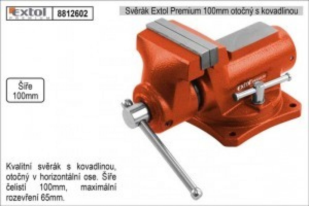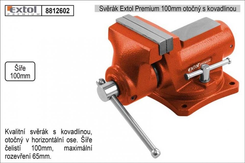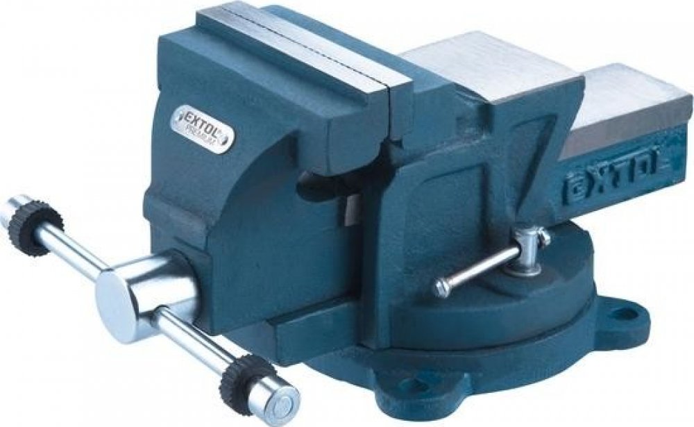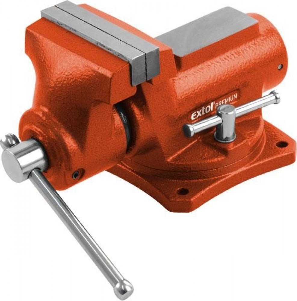 Svěrák stolní otočný 100mm s kovadlinou. Montážní svěrák s kovadlinou Extol Premium. Masivní svěrák z kvalitní litiny, jehož tělo a pohyblivé rameno odlité každé z jednoho kusu zaručuje velkou odolnost a pevnost. Obsluha otočného mechanismu je usnadněna rychloupínacímy šrouby bez použití klíče. Šířka čelistí: 100mm Maximální rozevření: 70mm Hmotnost: 6,4Kg
