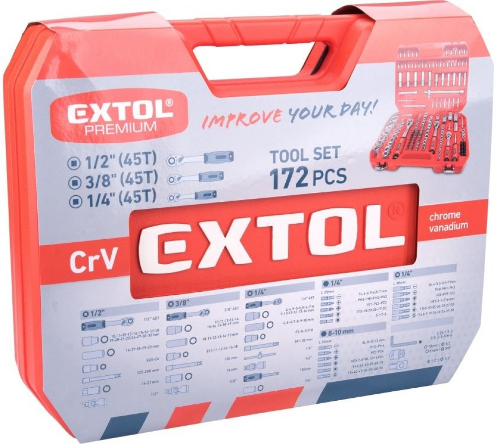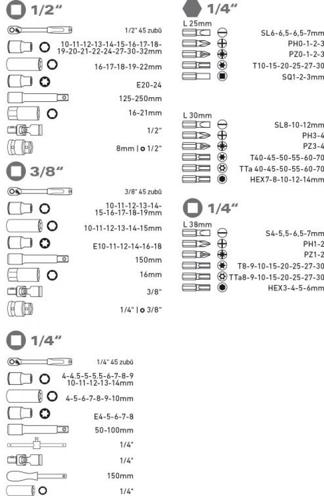 • ráčna: 1/4" (45T), 3/8" (45T), 1/2" (45T)