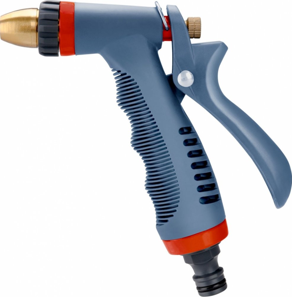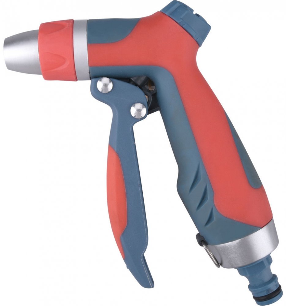 Hadicový postřikovač zahradní kovový v kombinaci pryže s ABS plastem.a tryska s aretací průtoku.