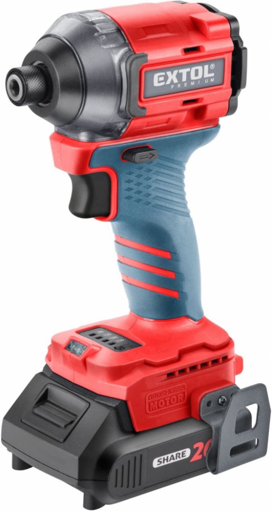 Součástí balení je Li-Ion akumulátor 20 V / 2,0 Ah s indikátorem nabití. Systém SHARE20V umožňuje použití akumulátoru napříč celou řadou nářadí EXTOL SHARE20V. Lithium-iontová technologie umožňuje dobíjení bez paměťového efektu a vyznačuje se nízkým samovybíjením.