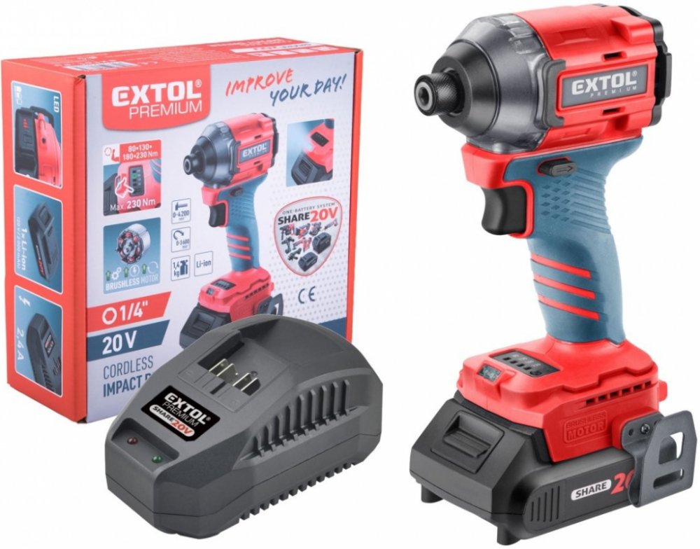 Extol 230 Nm 1.4 kg 20 V 1/4" bezkartáčový středně těžké 3600 ot/min. 4200 ú/min 2 Ah 50 min 117 mm