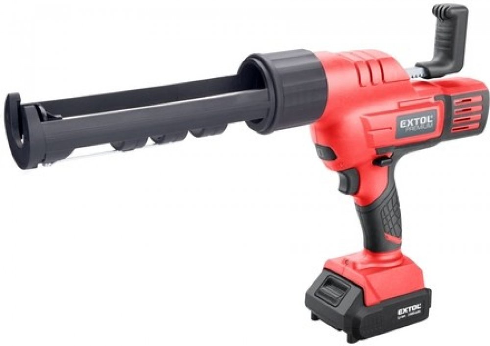 Aku vytlačovací vaničková pistole je určena k vytlačování silikonu, chemických kotev apod. z kartuší. Rychlost posuvu lze nastavit na 6polohovém regulátoru v rozsahu 50-560mm/min, což umožňuje přesnou regulaci toku hmoty. Silný motor a převody vyvinou tlak až 2000N tlačné síly. Pistole má funkci ANTI-DRIP, která po zastavení pistole automaticky popojede nazpátek a díky tomuto uvolnění tlaku v tubě, nepokračuje vytlačování hmoty. Pro zrychlení práce není zpětný chod motorizovaný, ale jen rychle povytáhnete píst. Vaničku je možno otočit v rozsahu 360°. Stroj je vybaven ochrannou proti přetížení. Rukojeť je pokryta měkkou protiskluzovou gumou, která snižuji vibrace a dobře se drží. Přímo nad baterií je umístěno osvětlení, které osvětluje pracovní místo. Pro běžnou práci dostačují jeden nebo dva 2000mAh akumulátory, které můžete rychle nabít v rychlonabíječce, pro náročnější nebo delší práci doporučujeme větší akumulátory s kapacitou 4000–8000mAh. Akumulátor lze použít ve všech typech nářadí řady EXTOL SHARE20V. Díky použité Li-ion technologii je ho možné kdykoliv dobíjet, aniž by se tím snižovala jeho kapacita. Li-ion akumulátor ztrácí energii vlivem samovybíjení velmi pomalu a vydrží dlouho nabitý a připravený k použití.