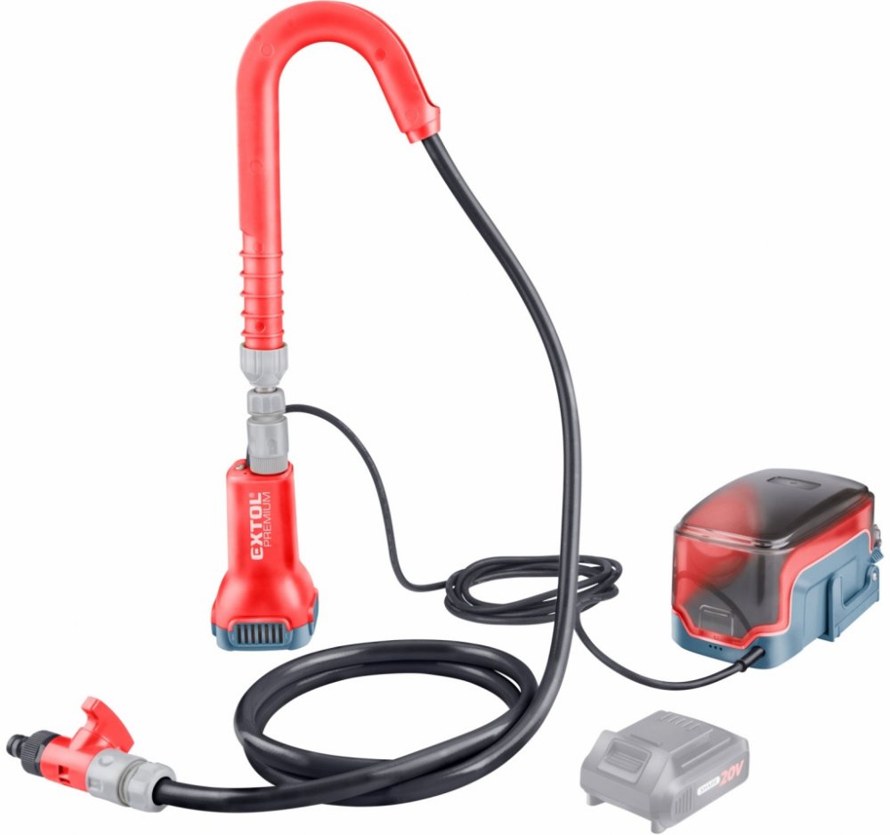 Aku čerpadlo do sudu je určeno pro čerpání čisté vody ze sudů s dešťovou vodou a díky své výtlačné výšce 21m dostane vodu na celou plochu domácí zahrady i v případě, že má vysoké převýšení. Se sudovým čerpadlem odpadá nošení těžkých konví s vodou pro zalévání na zahradní hadici lze totiž připojit různá zavlažovací a kropící/ zalévací příslušenství a s použitím kropítka na tyči lze komfortně zalévat květiny v květináčích ve výšce, rosit květiny mlhou nebo s použitím kropícího příslušenství pro zalévání trávníku lze tak k zalévání trávníku použít dešťovou vodu. Aku verze navíc umožňuje používat čerpadlo v místech kde není přístup k elektrické energii. Čerpadlem projdou pevné nečistoty o maximální velikosti 0,5mm. Na výstupu čerpadla je flexibilní hadice s ventilem, kterým lze upravit průtok vody dle potřeby a běžná rychlospojka na kterou si můžete jednoduše připojit co potřebujete. Pro zjednodušení obsluhy má čerpadlo na výstupu hadici s hákem a lze ho zavěsit do sudu. Čerpadlo je určeno k čerpání čisté užitkové vody bez obsahu jakéhokoli mechanického znečištění. Baterie je uložena ve vodovzdorném krytu s hákem pro zavěšení. Pro běžnou práci dostačují jeden nebo dva 2Ah akumulátory, které můžete rychle nabít v rychlonabíječce, pro náročnější nebo delší práci doporučujeme větší akumulátory s kapacitou 4–8Ah. Akumulátor lze použít ve všech typech nářadí řady EXTOL SHARE20V. Díky použité Li-ion technologii je ho možné kdykoliv dobíjet, aniž by se tím snižovala jeho kapacita. Li-ion akumulátor ztrácí energii vlivem samovybíjení velmi pomalu a vydrží dlouho nabitý a připravený k použití.