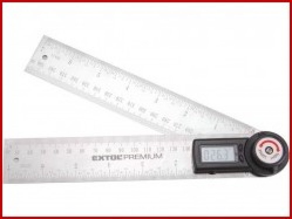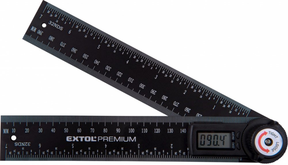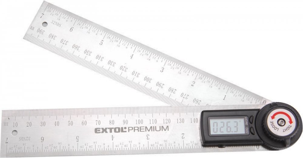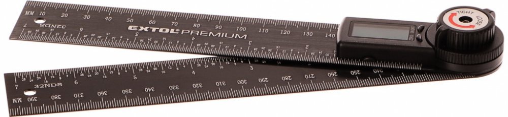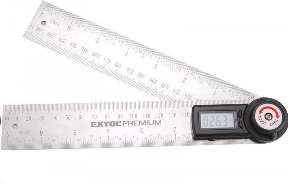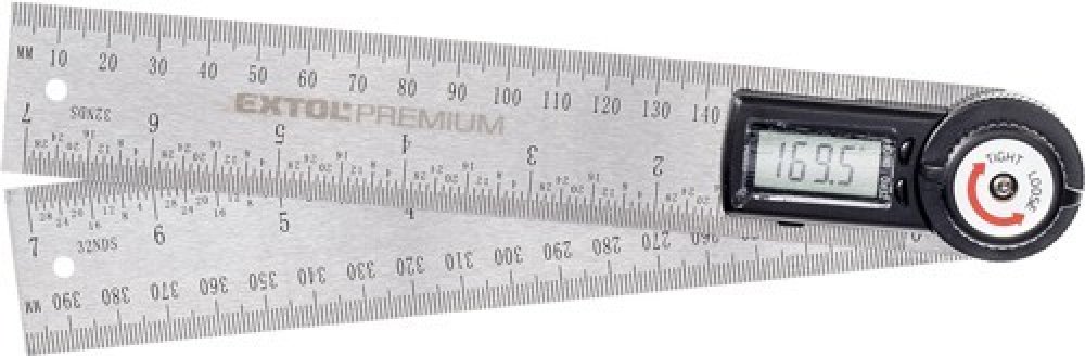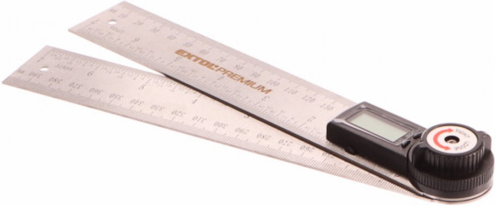 Digitální úhloměr s pravítkem Extol Premium, je určen k měření úhlu a také délky. Součástí úhloměru je šroub aretace ramen pro přenášení nastaveného úhlu. Úhloměr nalézá uplatnění při kutilských, truhlářských a stavebních prací.