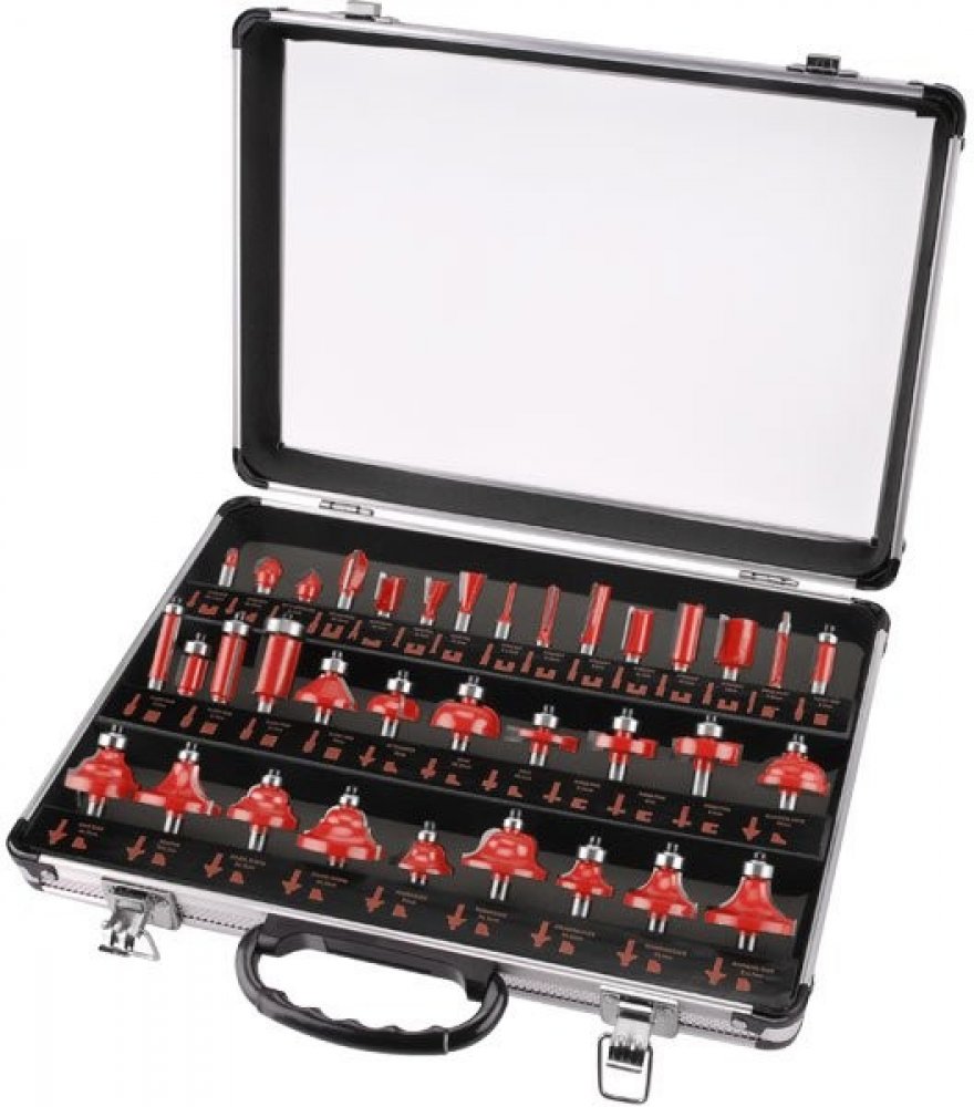Tvarové frézy do dřeva (35ks) s SK karbidovými plátky a vodícím kolečkem, stopka 8mm v kovovém kufru.