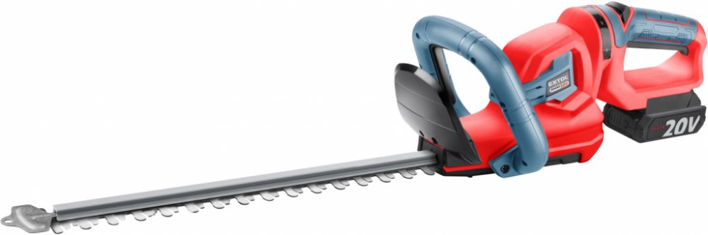 Aku nůžky jsou určeny ke stříhání živého plotu až se středně silnými větvičkami v domácích zahradách. Maximální průměr střihaných větví je 16mm. Ostrá stříhací čepel si snadno poradí s živým plotem a je osazena hliníkovou lištou, která ji chrání před poškozením. Tuto čepel lze otáčet až o 90˚ což usnadňuje stříhání ve vertikální i horizontální poloze. Proti odletujícím kouskům větví je uživatel chráněn pevným plastovým krytem. Stroj je vybaven bezpečnostní pojistkou, která se aktivuje při vyklouznutí z rukou a elektronickou doběhovou brzdou, která zajistí jeho rychlé zastavení. Pogumovaná rukojeť brání vysmeknutí, tlumí vibrace a zpříjemňuje držení při práci. Nůžky jsou navrženy tak, aby byly lehké a ergonomické. Mají dobře vyváženou konstrukci, která snižuje namáhání rukou a zad při delší práci. Díky napájení z baterie již není nutné dávat pozor na napájecí kabel a manipulace s nimi je pohodlnější. Také nikoho nebude rušit hlukem, který vydávají benzínové modely. Aku nůžky nevyžadují složitou péči. Stačí je pravidelně čistit, udržovat ostří čepele a kontrolovat stav baterie. Pro běžnou práci dostačují jeden nebo dva 2Ah akumulátory, které můžete rychle nabít v rychlonabíječce, pro náročnější nebo delší práci doporučujeme větší akumulátory s kapacitou 4–8Ah. Akumulátor má indikátor nabití a lze použít ve všech typech nářadí řady EXTOL SHARE20V. Díky použité Li-ion technologii je ho možné kdykoliv dobíjet, aniž by se tím snižovala jeho kapacita. Li-ion akumulátor ztrácí energii vlivem samovybíjení velmi pomalu a vydrží dlouho nabitý a připravený k použití.
