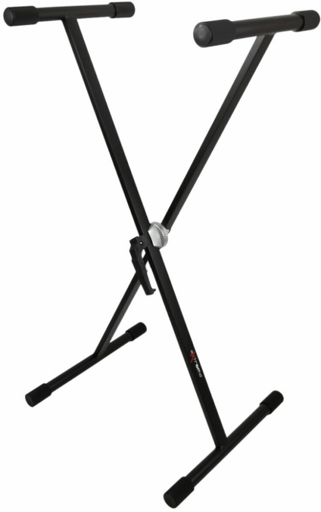 univerzální klávesový stojan typu X, jednoduché nohy, rychloupínací páka, nastavitelná výška 26 až 99 cm, hloubka 40 cm, šířka 23 až 99 cm, průměr trubky 28 mm, nosnost 40 kg, hmotnost 2.8 kg, barva černá