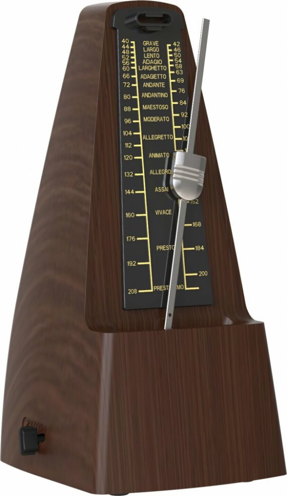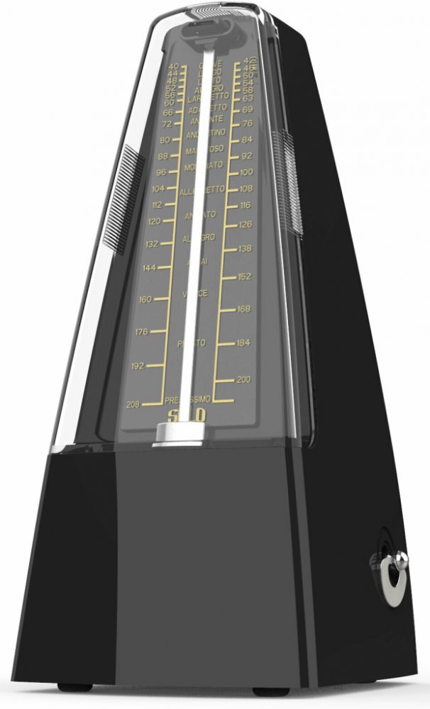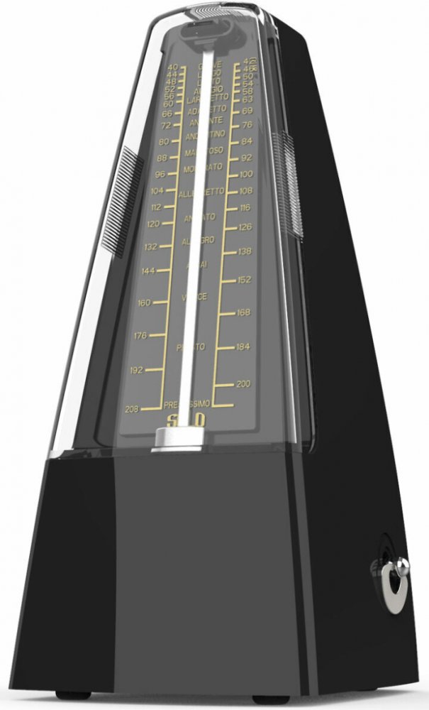 mechanický metronom se zvonkem, natahovací mechanismus, rozsah nastavení tempa 40 - 208 BPM, možnosti nastavení taktu na 0 (bez důrazu), 2, 3, 4, 6, plastové provedení, protiprachová plastová krytka, rozměry: výška 20 cm, šířka 9 cm, hlouka 11 cm, barva černá