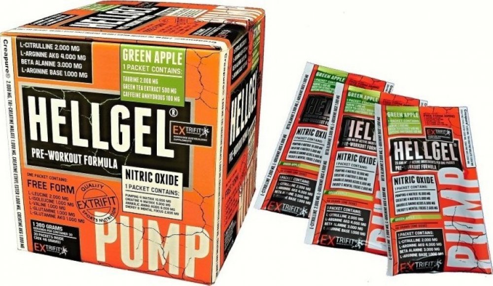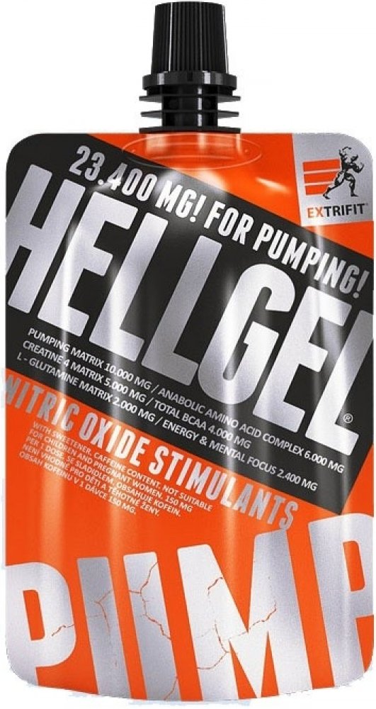 Hellgel® je světovým unikátem, protože Extrifit byl první firmou, která použila gelovou formu pro NO produkt. Hellgel® je nesmírně populární dnes již po celé Evropě. Největší výhodou Hellgelu je to, že nemusíte nic připravovat, nic míchat. Kompletní substance je hotová a je připravena k okamžitému použití. Kulturisté si nosí sáčky stále u sebe. Stačí vzít pár balíčků, které máte po ruce, a můžete je okamžitě použít. Dávka je vypočítána pro použití jak středně pokročilými, tak vyspělými sportovci. Hellgel® neobsahuje žádné cukry.