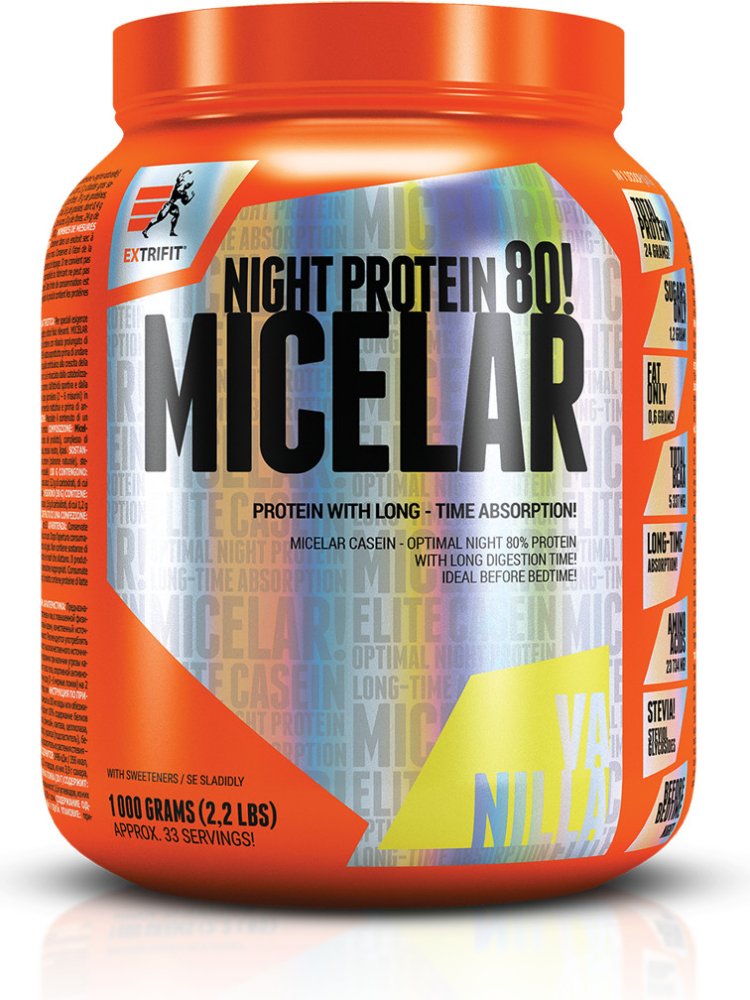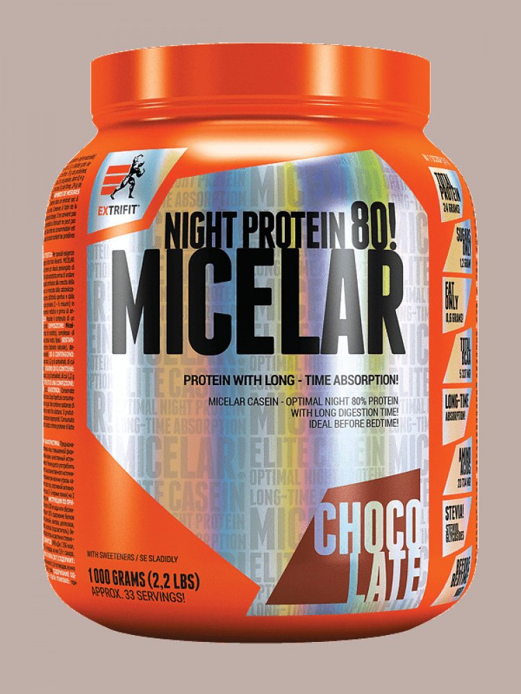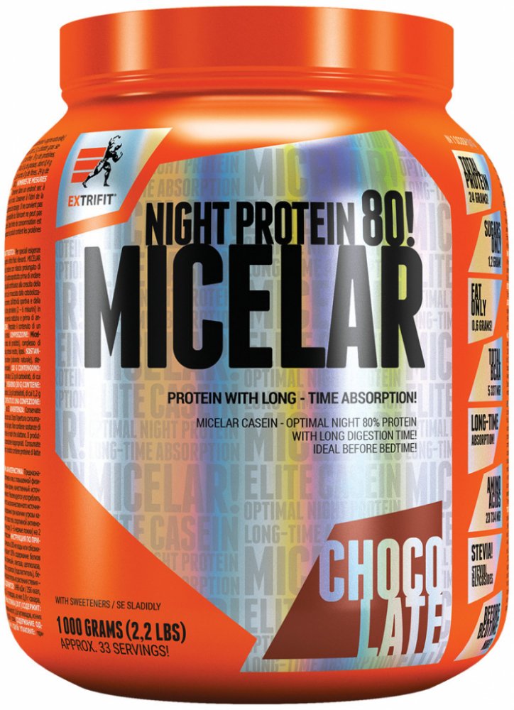 Micelar Casein obsahuje micelární kasein se sladidlem z rostliny stévie a přidanými sedmi trávicími enzymy pro dokonalé využití proteinu. Micelar Casein je kvalitní zdroj bílkovin s dlouhodobým uvolňováním aminokyselin. Konzumace produktu Micelar Casein je vhodná, když předpokládáte, že nebudete mít možnost se několik hodin najíst, např. ve škole, při zkouškách, na cestách a především před spánkem.